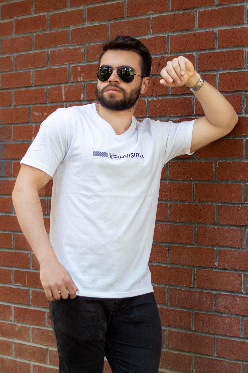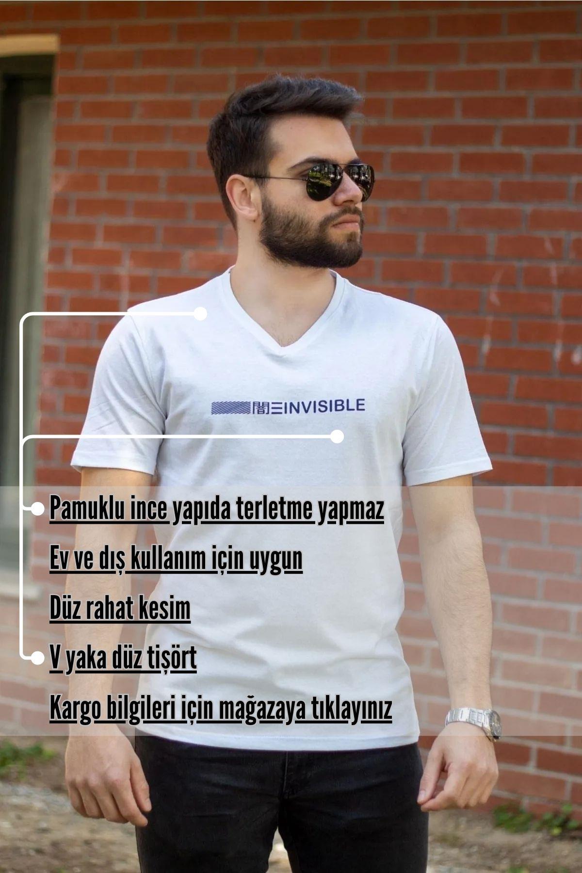 Beyaz Invisible Yazılı Kısa Kollu V Yaka Erkek Tişört 20ETSHNVSB