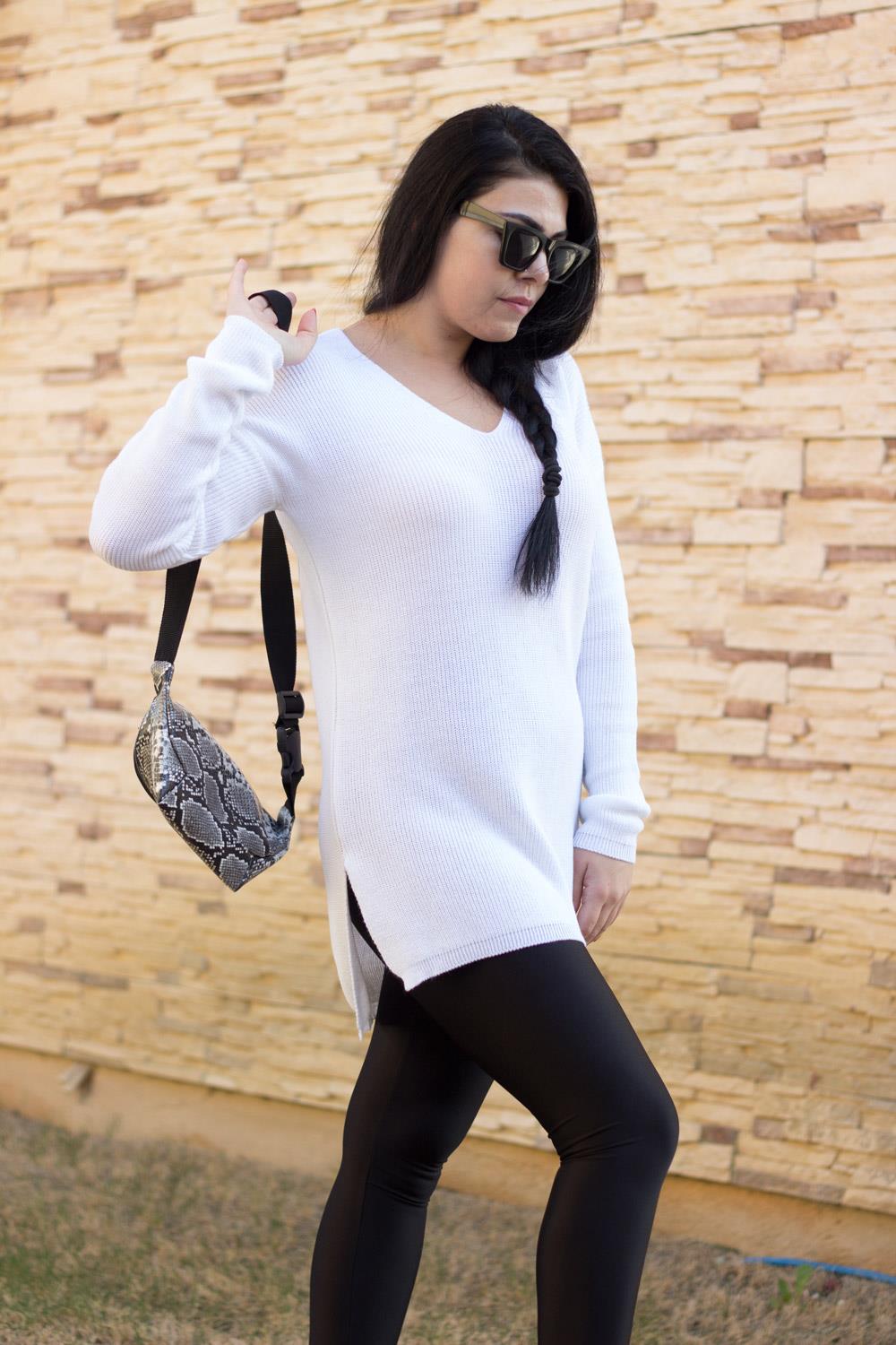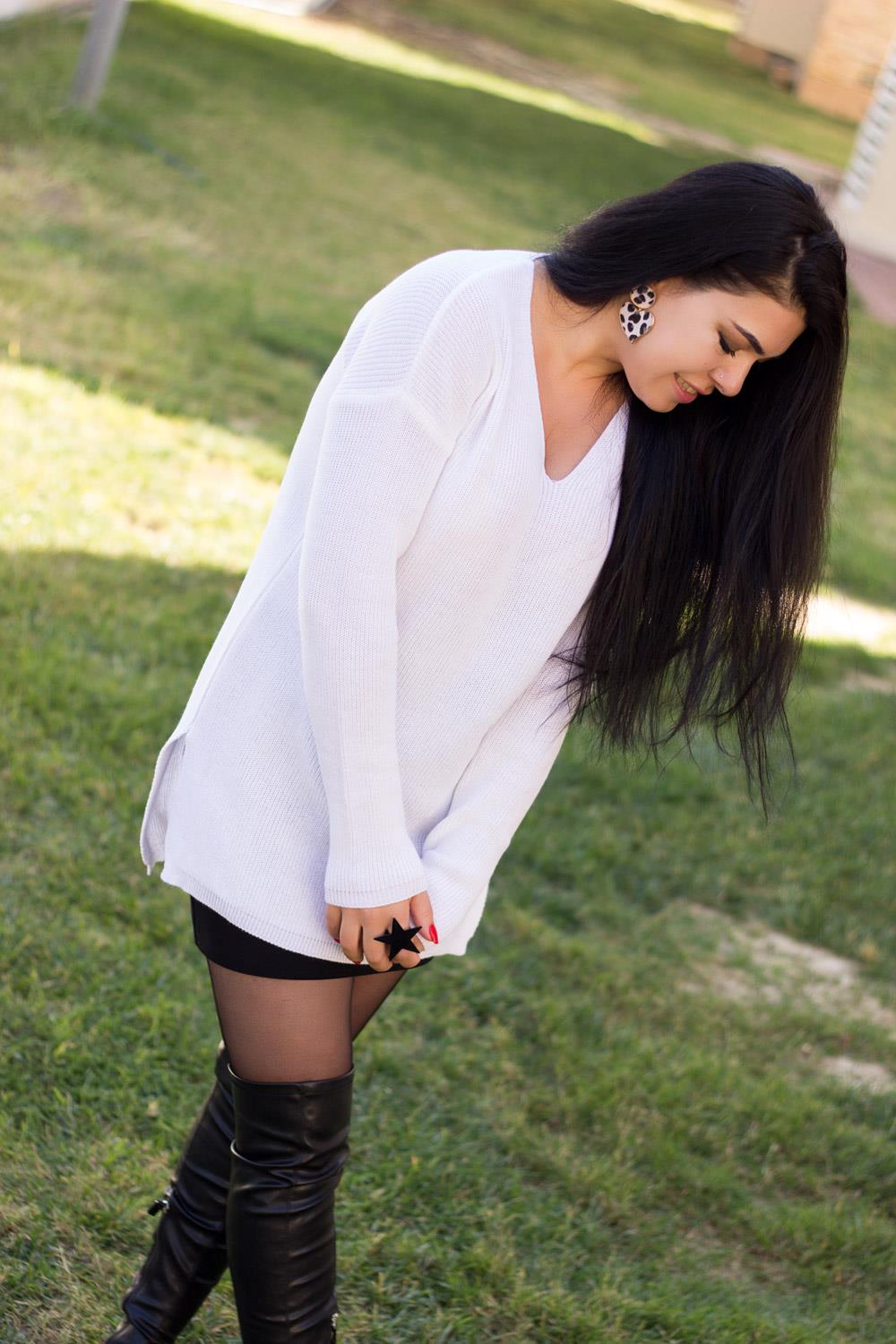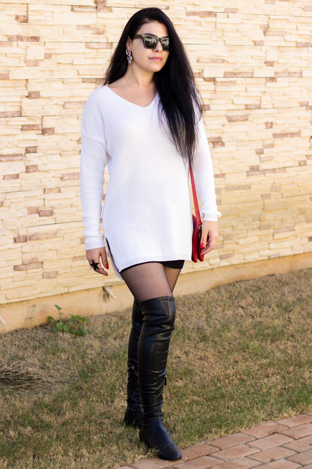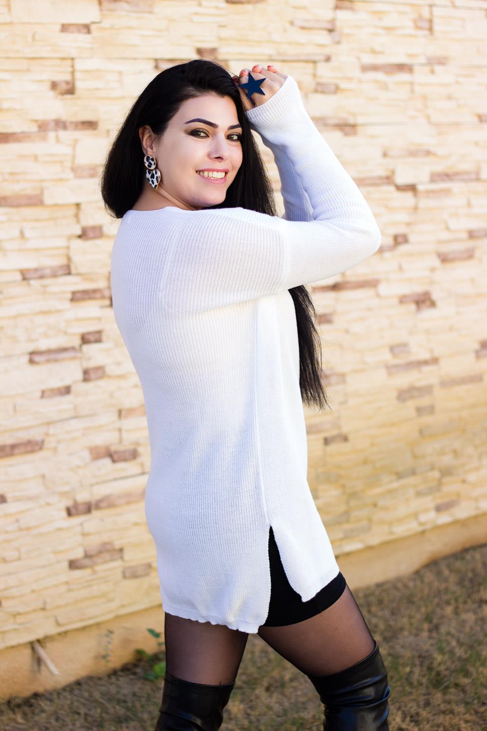 EtiketlerBeyaz V Yaka Yırtmaçlı Fitilli Triko Kadın Kazak 20KKZKYRTC