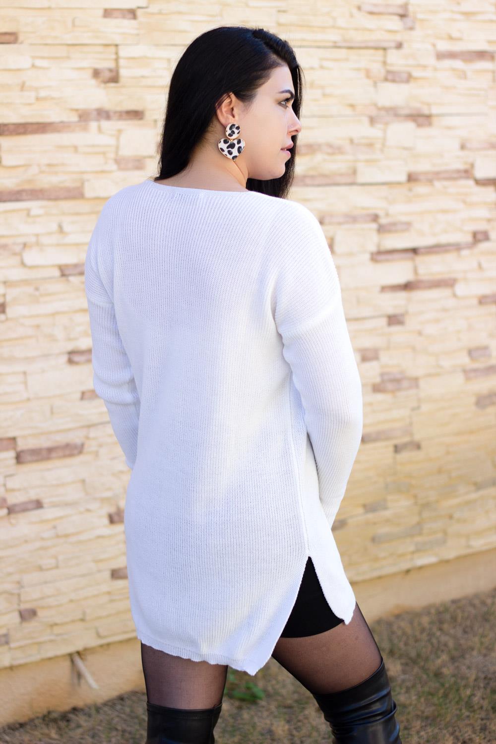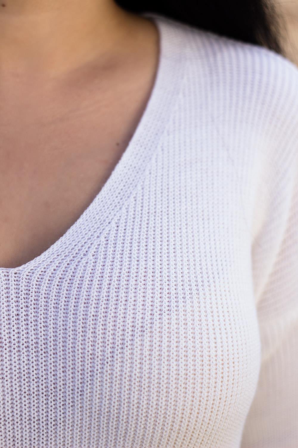 Beyaz V Yaka Yırtmaçlı Fitilli Triko Kadın Kazak 20KKZKYRTC