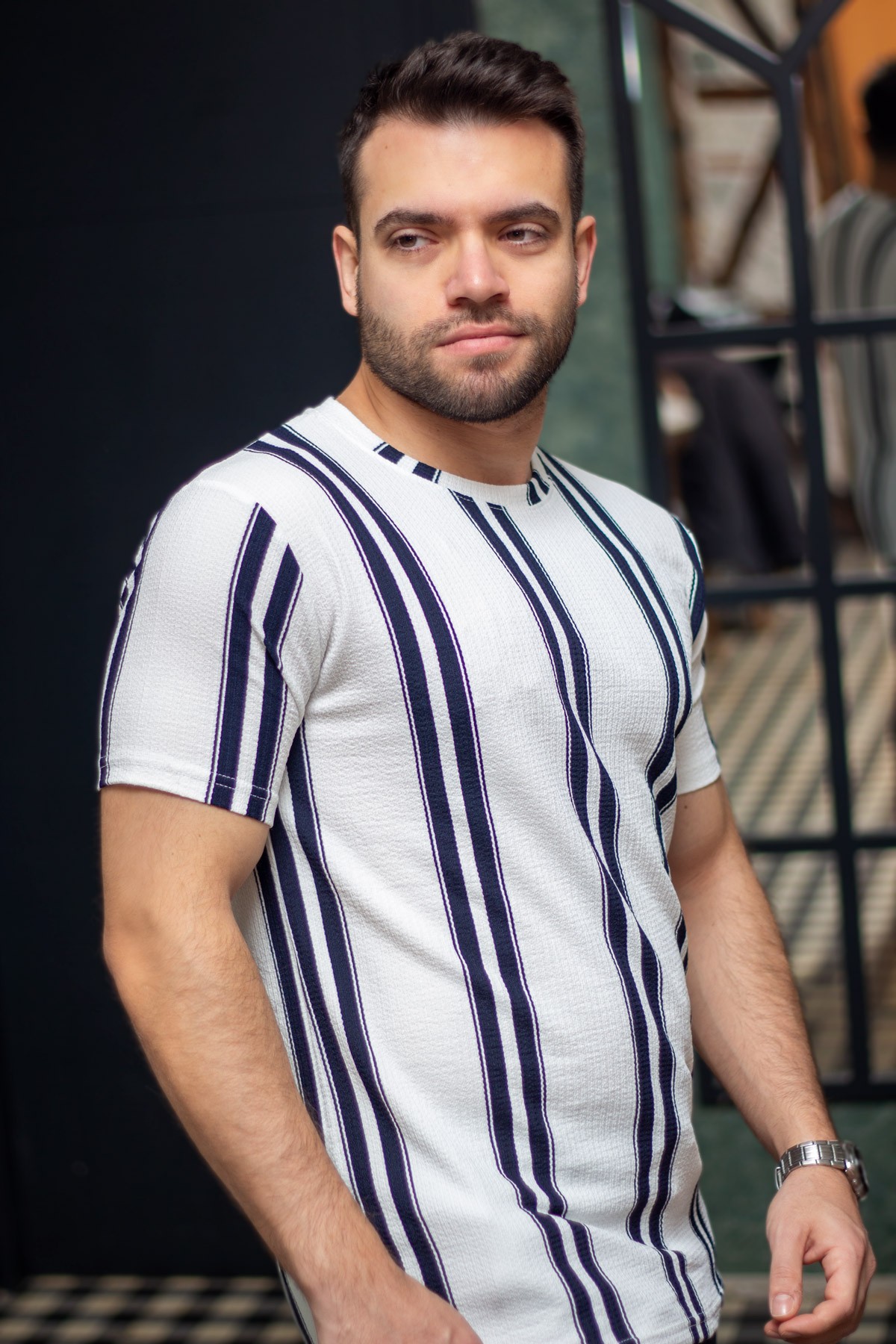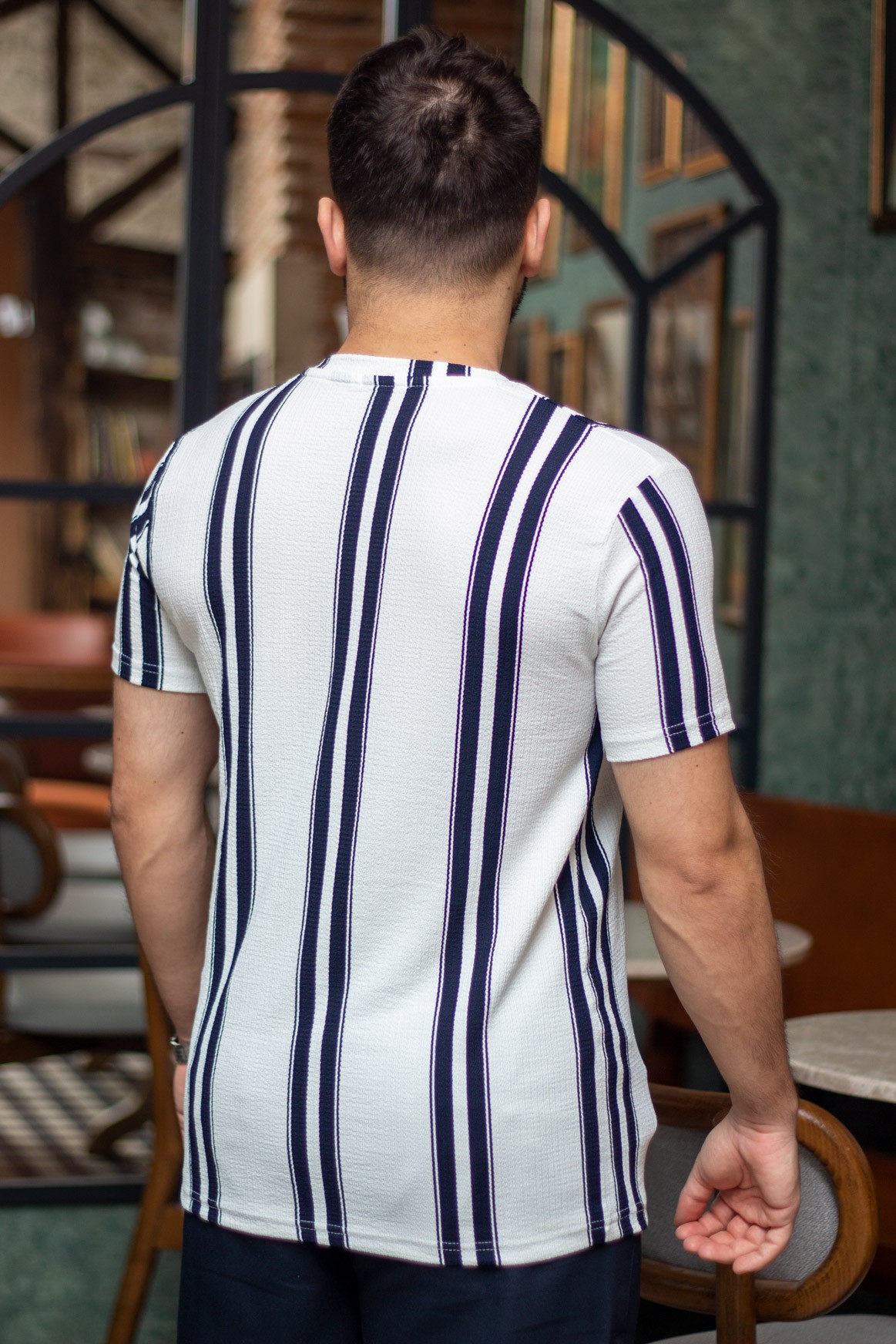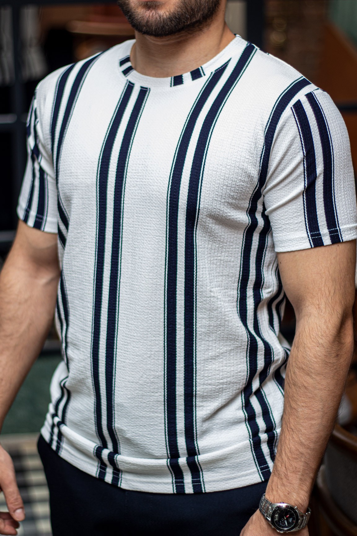 | Etiketler | Erkek Beyaz Lacivert Kalın Şerit Desen Esnek Krep Bürümcük Kumaş İnce Tişört 25ETSHKRIN |