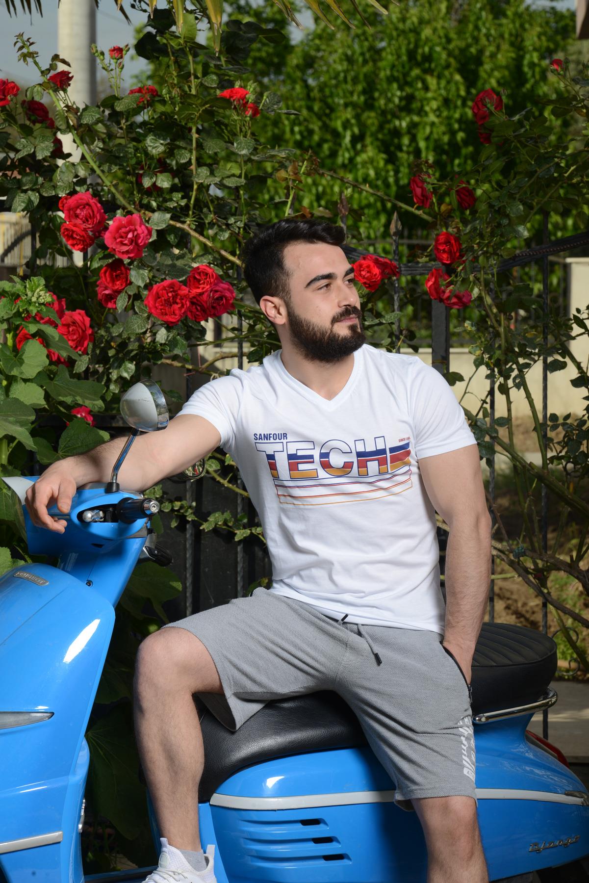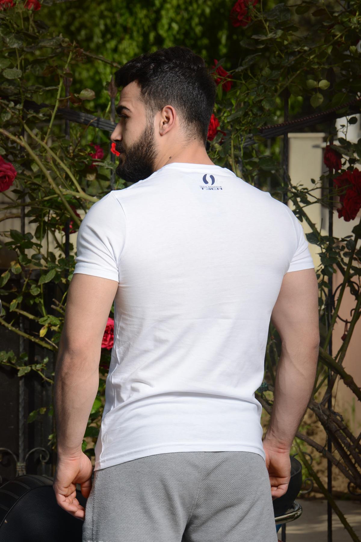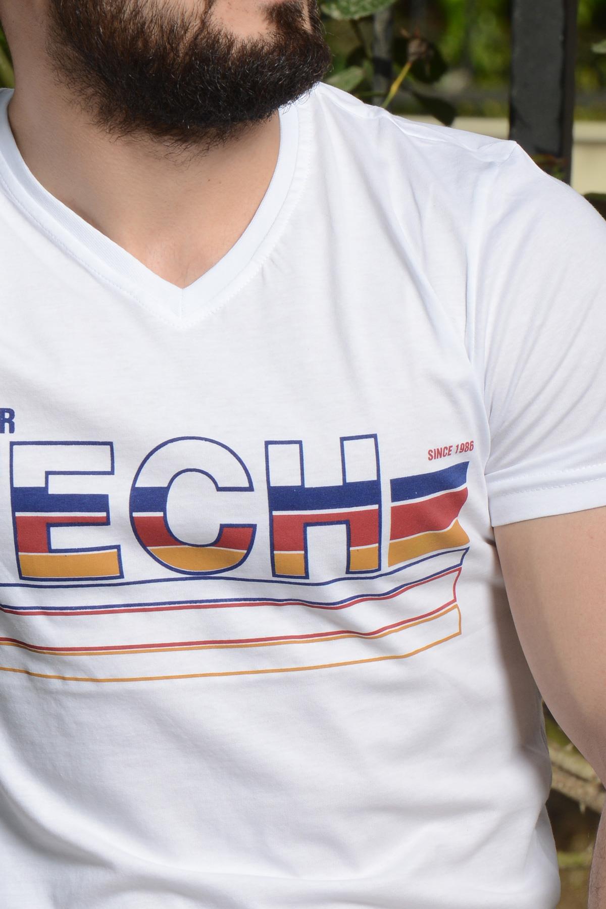 Erkek Beyaz Tech Yazılı V Yaka Kısa Kollu Tişört 21EBSKTECH