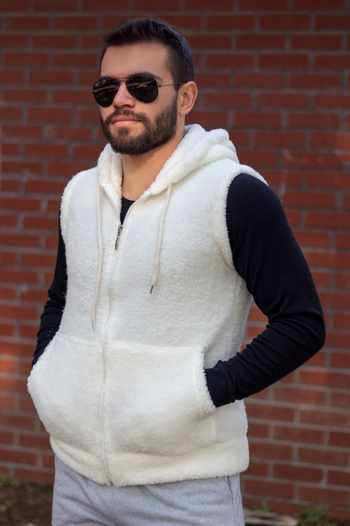 EtiketlerErkek Ekru Beyaz Peluş Yumoş Fermuarlı Kapüşonlu Yelek 22EYLKPELO