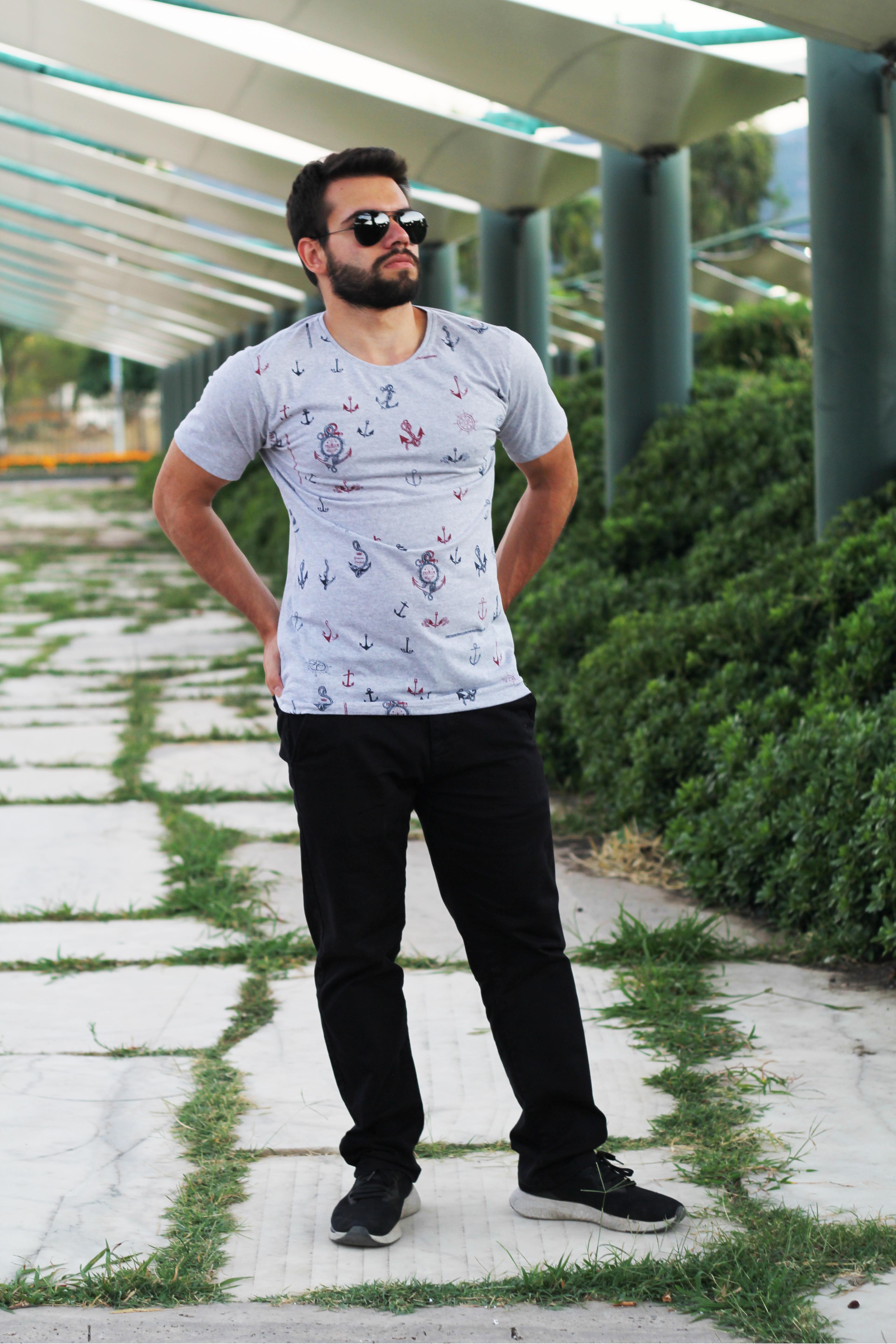 Erkek Gri Slim Fit Büyük Çapa Desenli Kısa Kollu Tişört 20ETSHBCAP