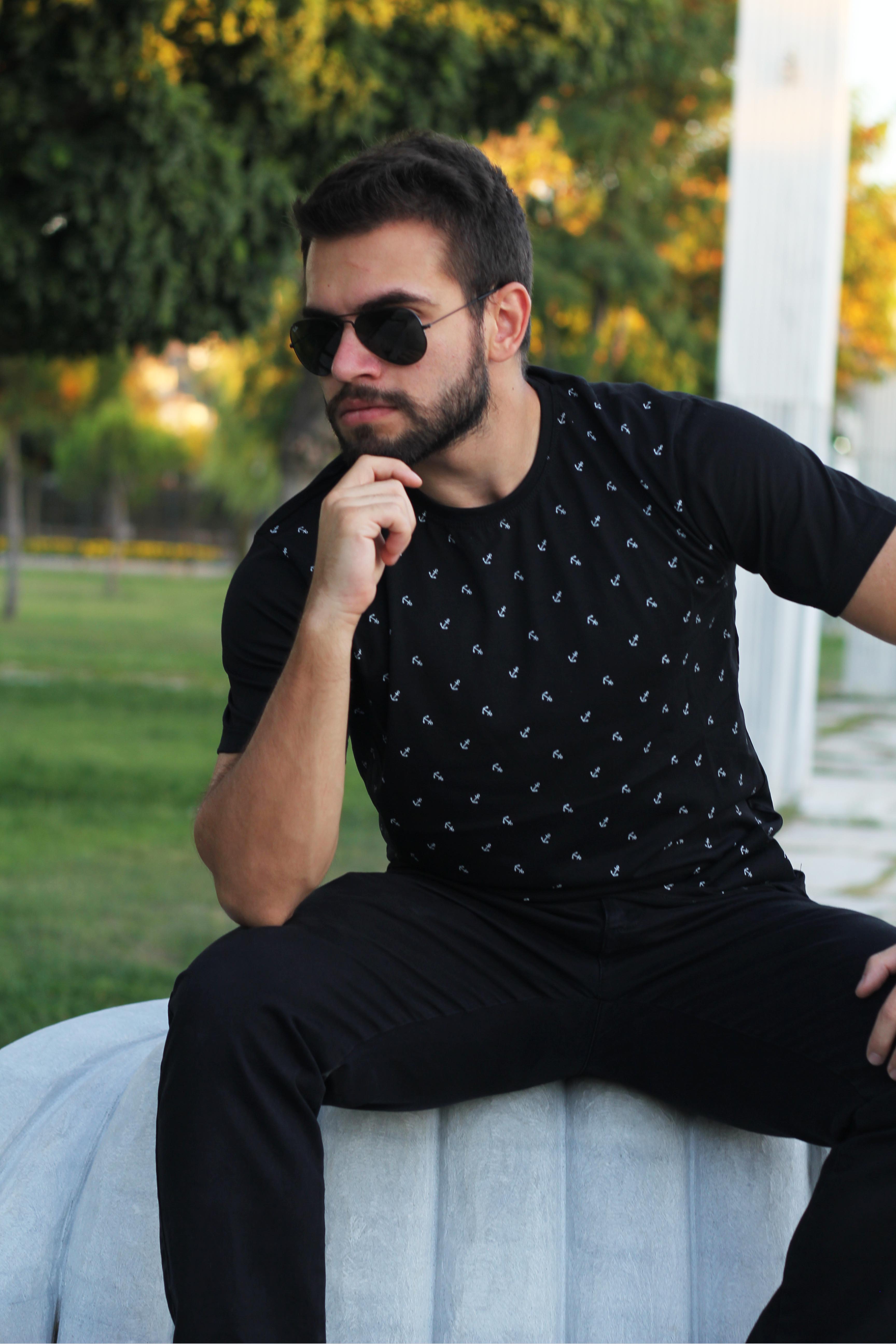 • Erkek Siyah Slim Fit Çapa Desenli Kısa Kollu Tişört 20ETSHCAPA
