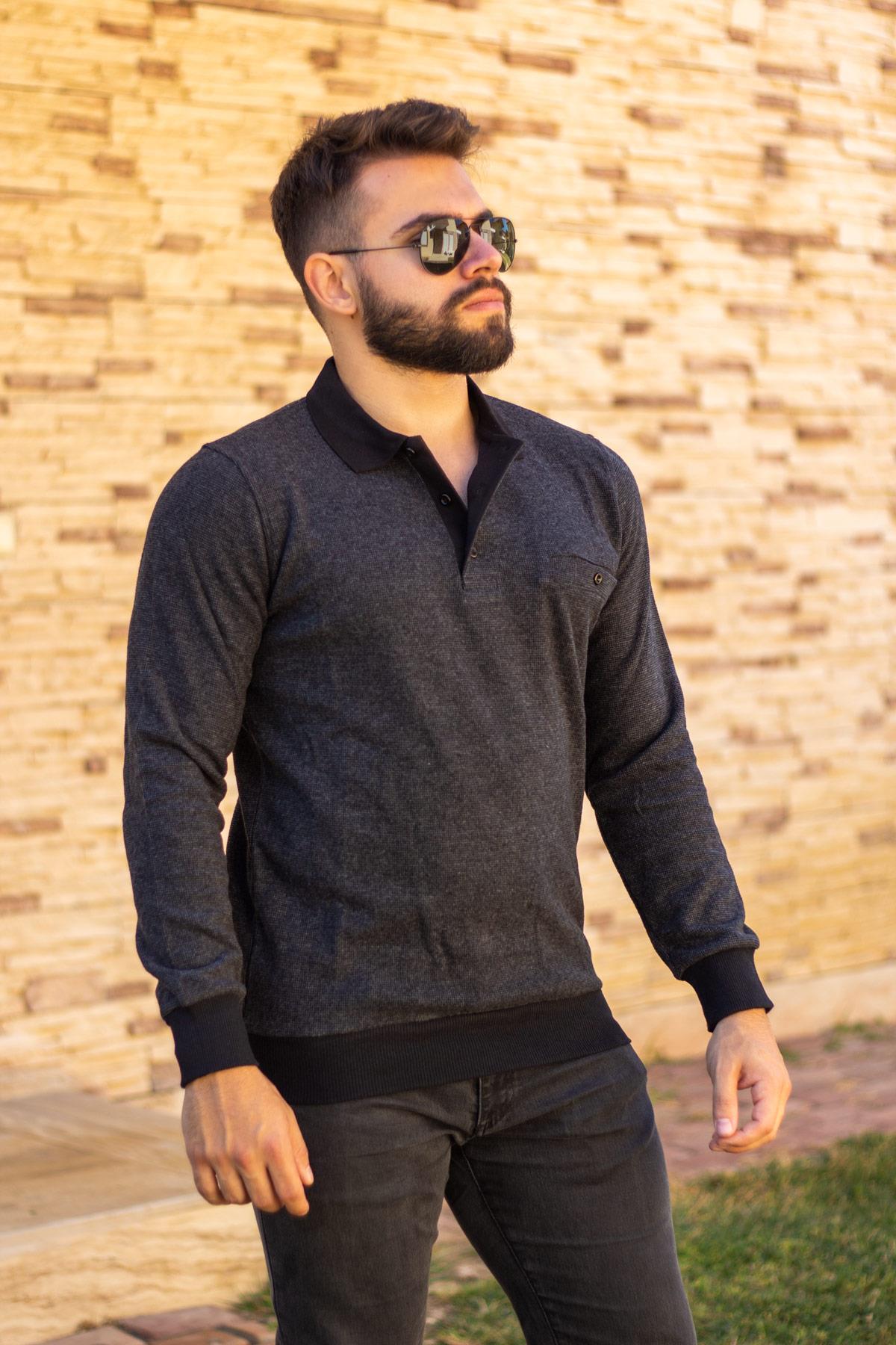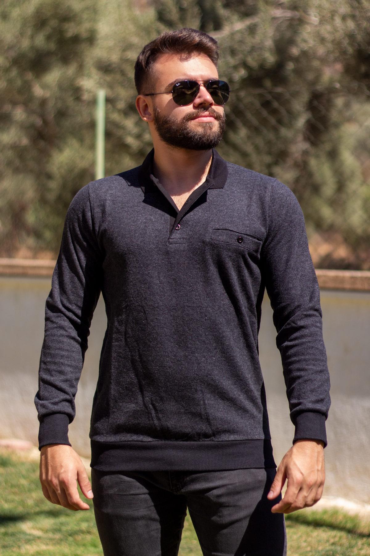 Erkek Siyah Polo Yaka Selanik Kumaş Sweat Kazak 21EKZKPLSL