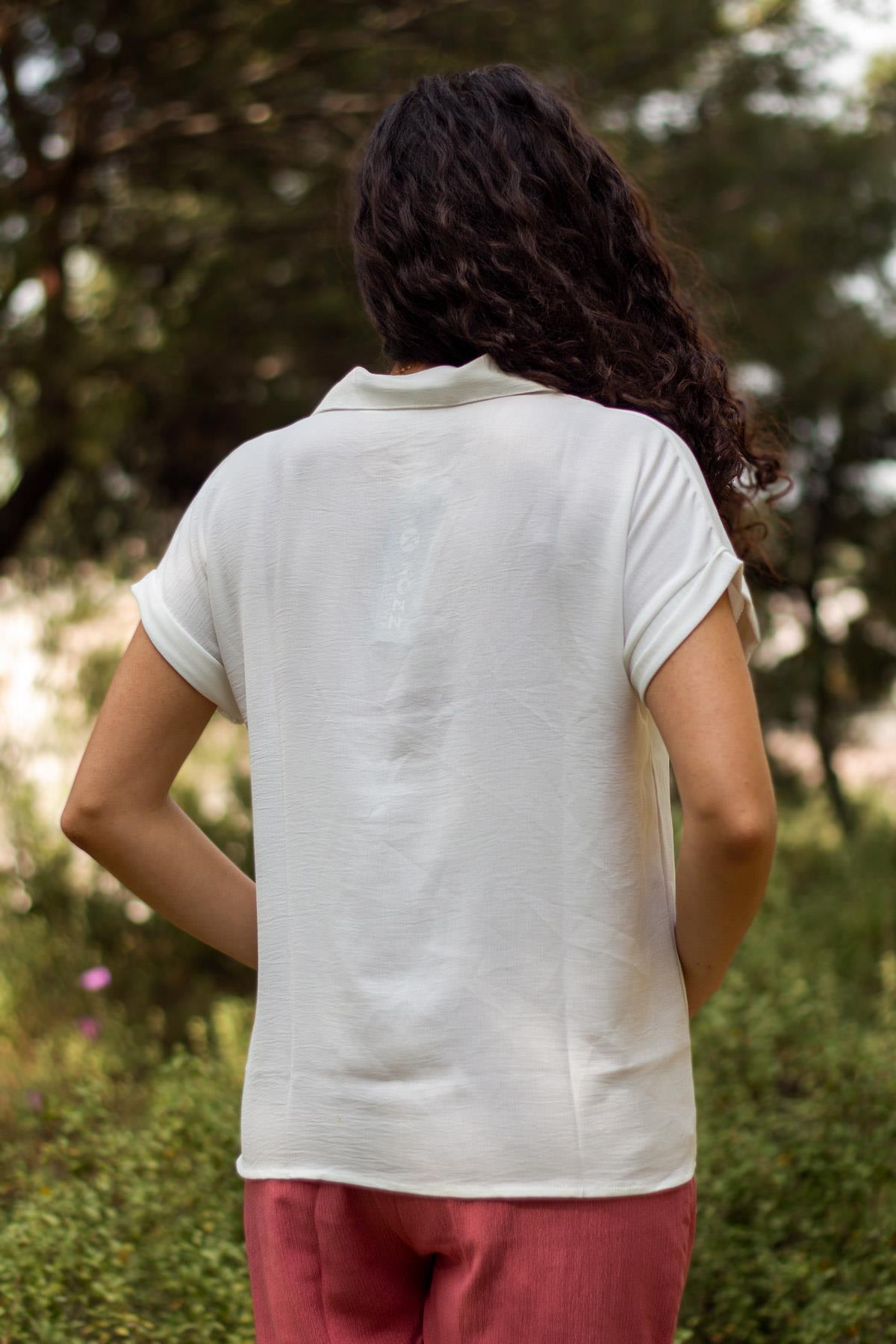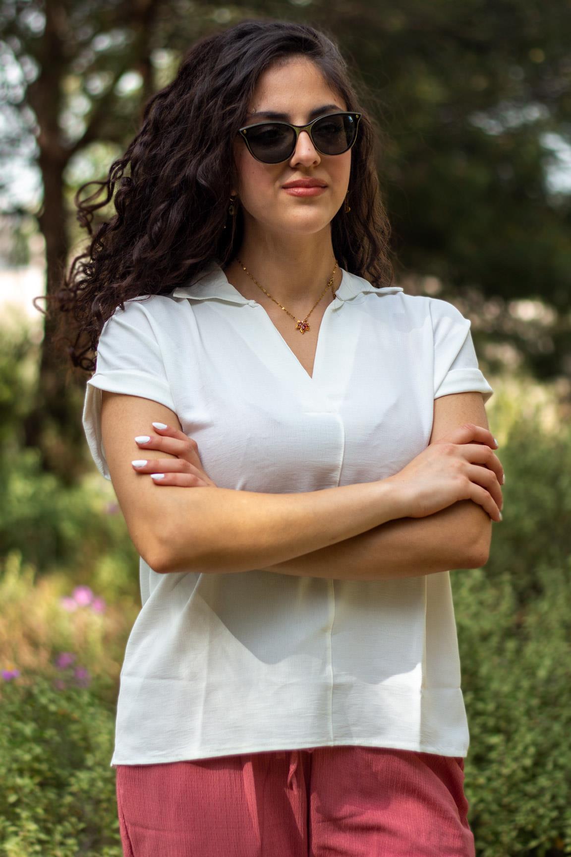 Kadın Beyaz Aerobin Kumaş Kısa Duble Kol Gömlek Yaka Bluz 24KBLZK800