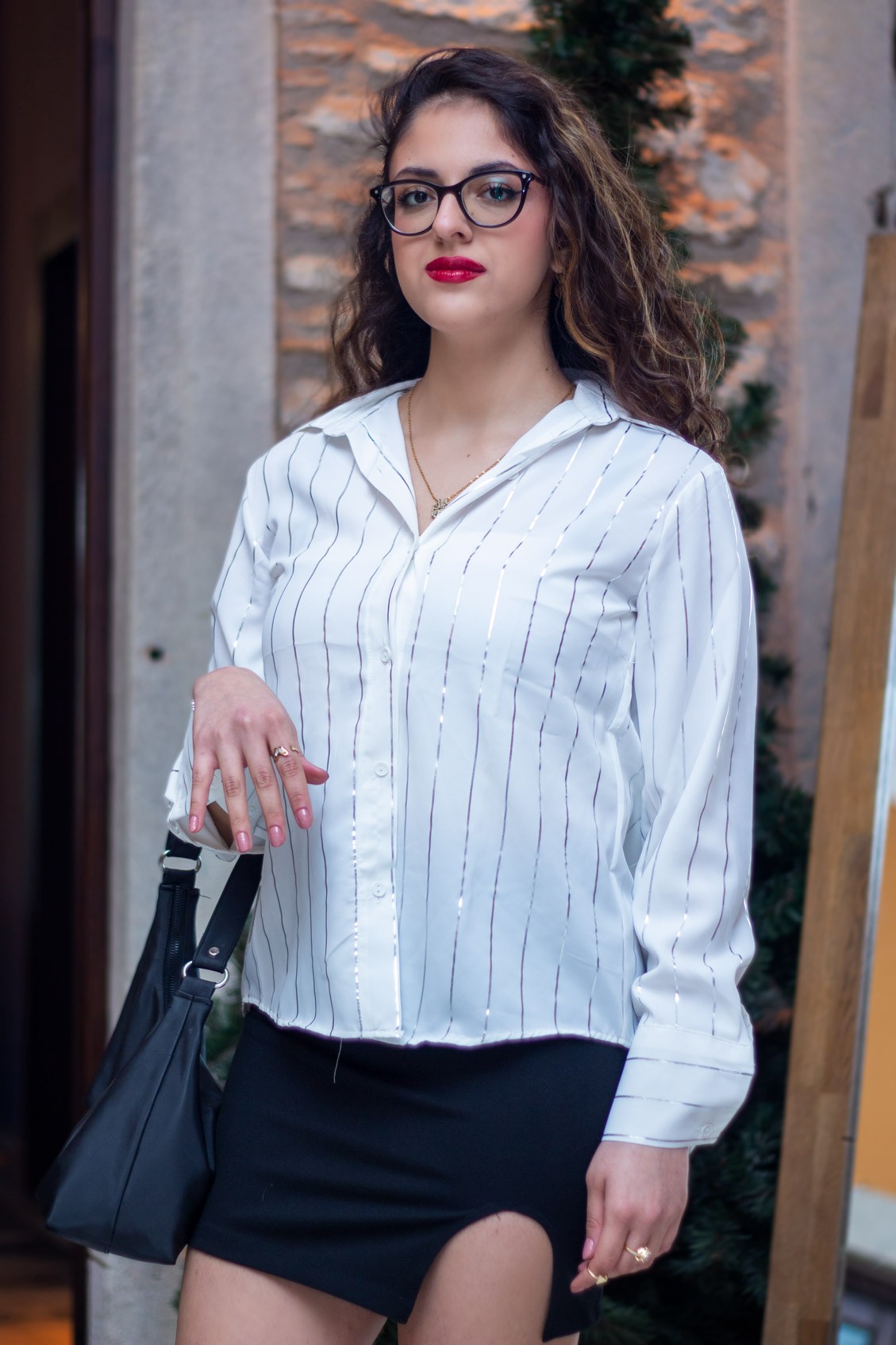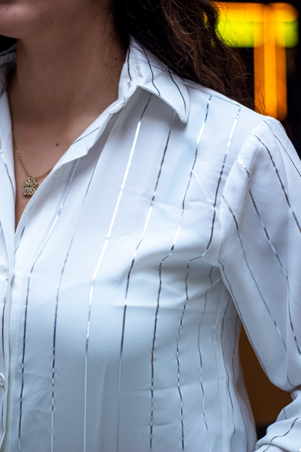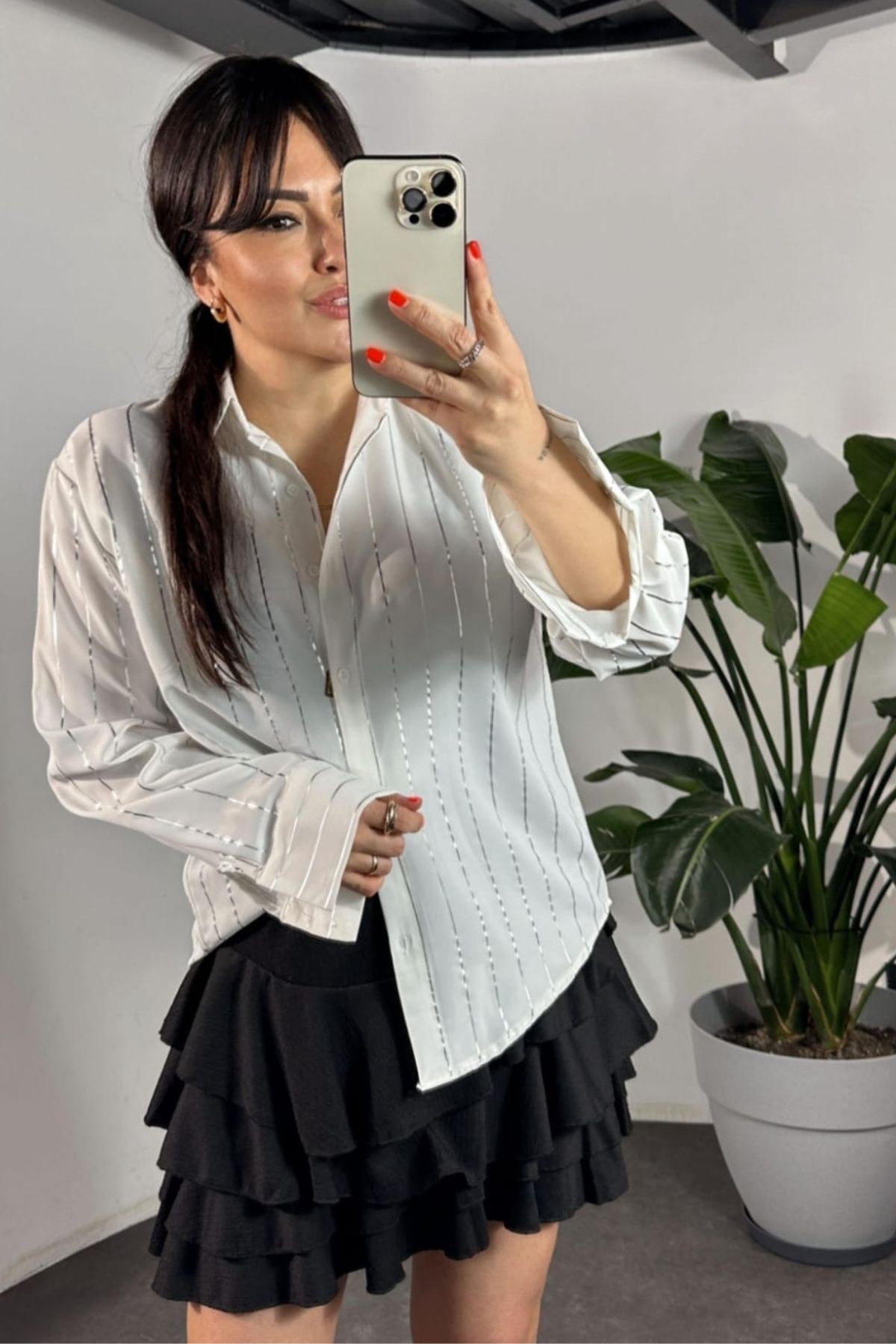 | Etiketler | Kadın Beyaz Jesica Parlak Gümüş Varak Çizgili İtal Jakar Kumaş İnce Gömlek 25KGMLP009 |