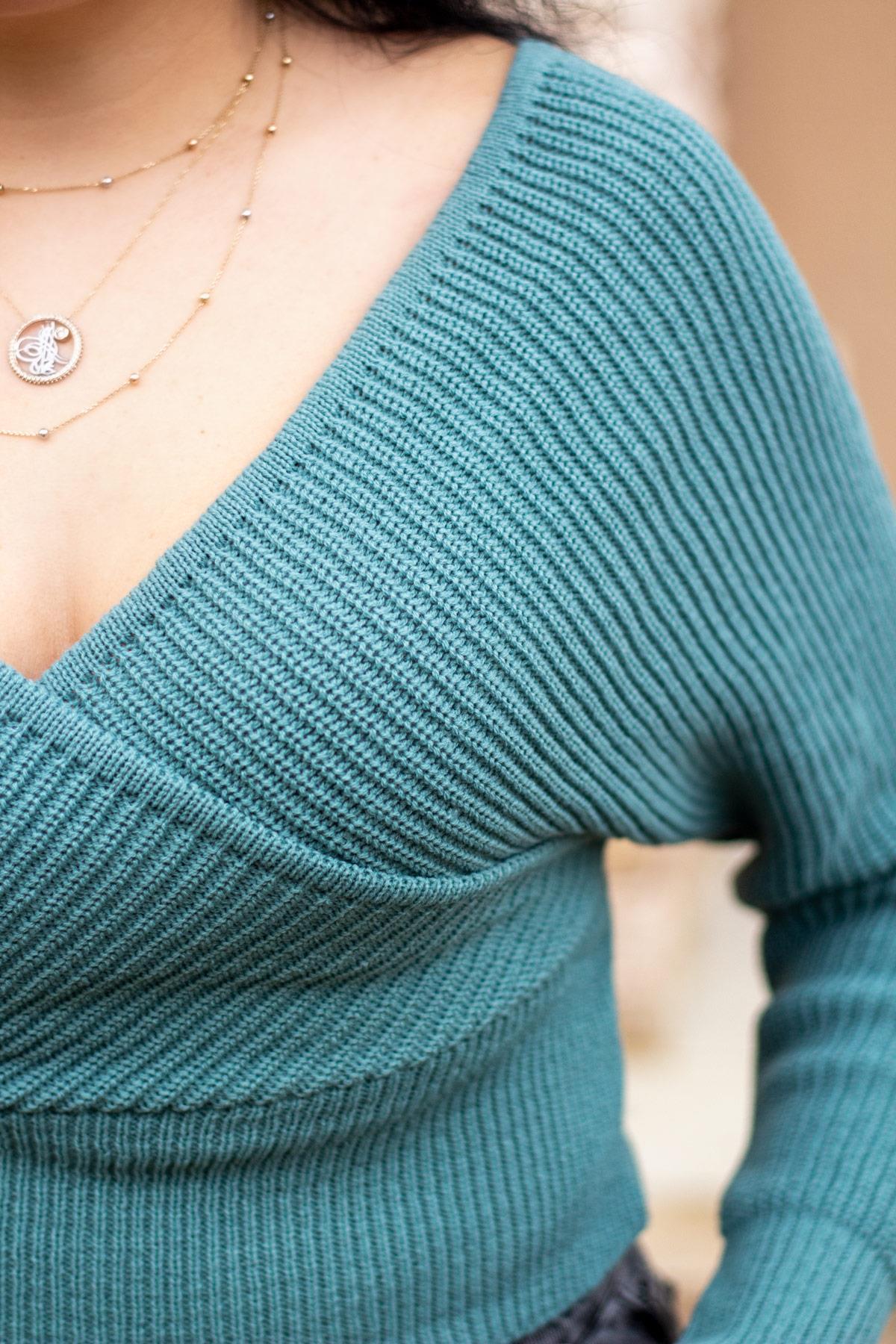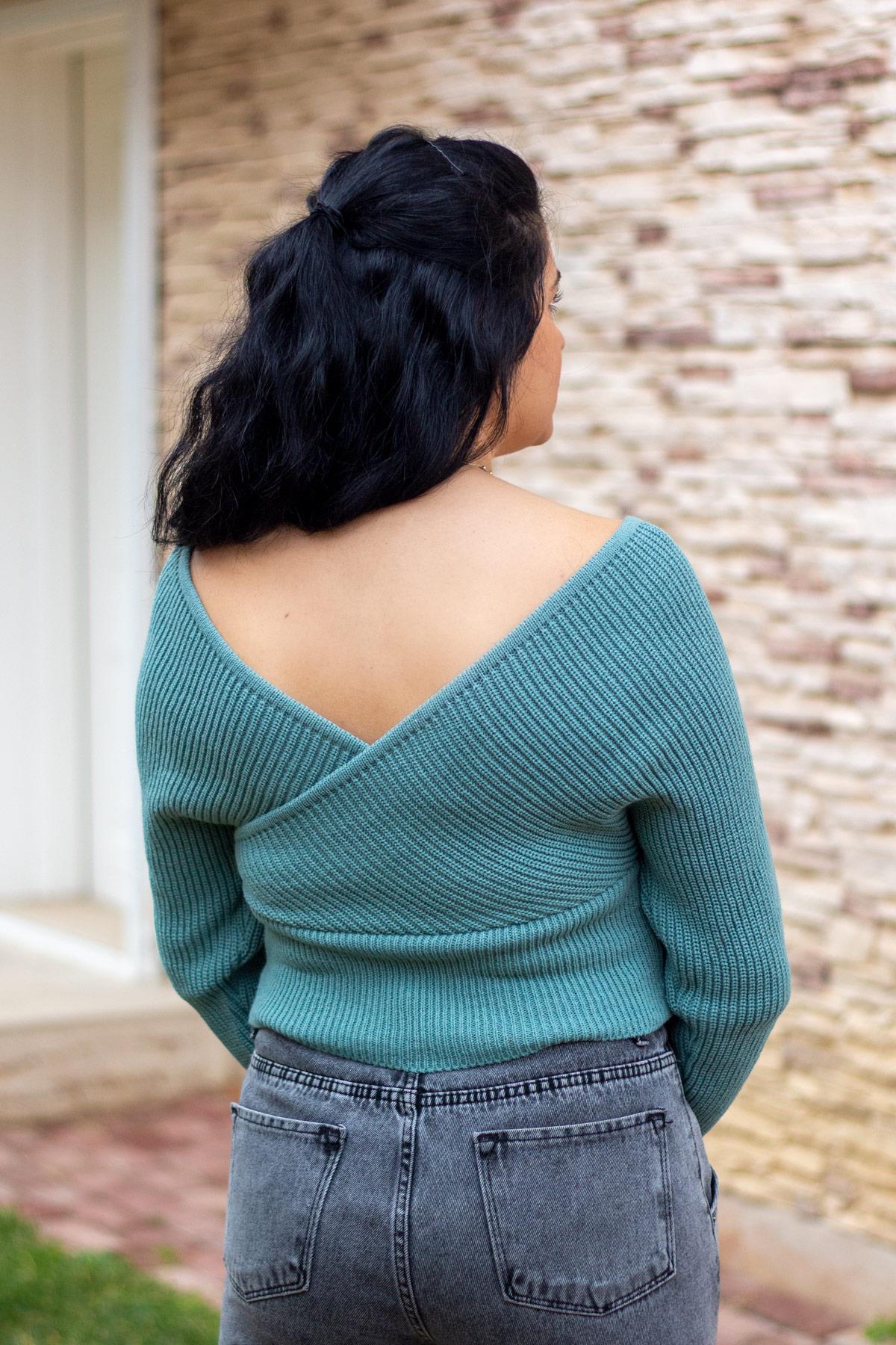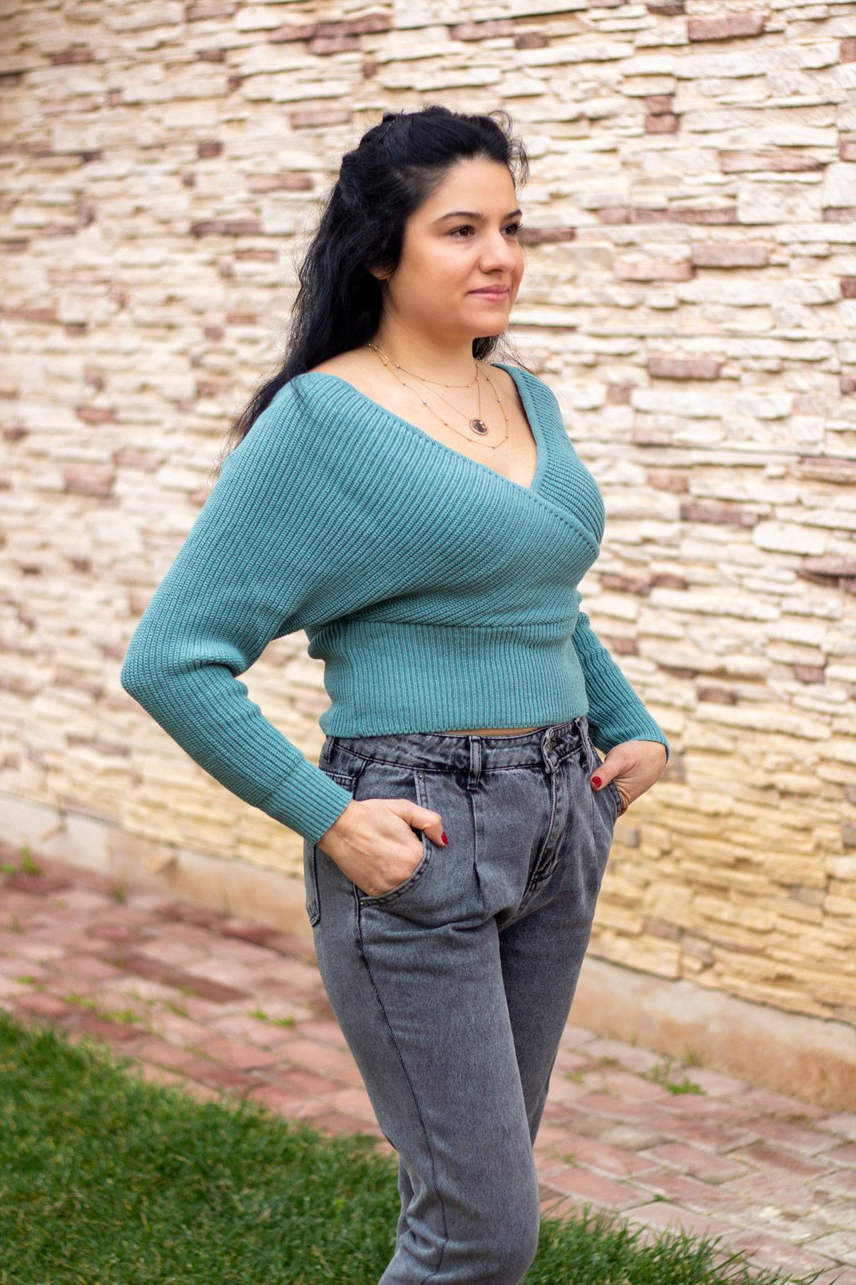 Kadın Yeşil Kruvaze V Yaka Fitilli Tiko Kazak 21KKZKKRVZ