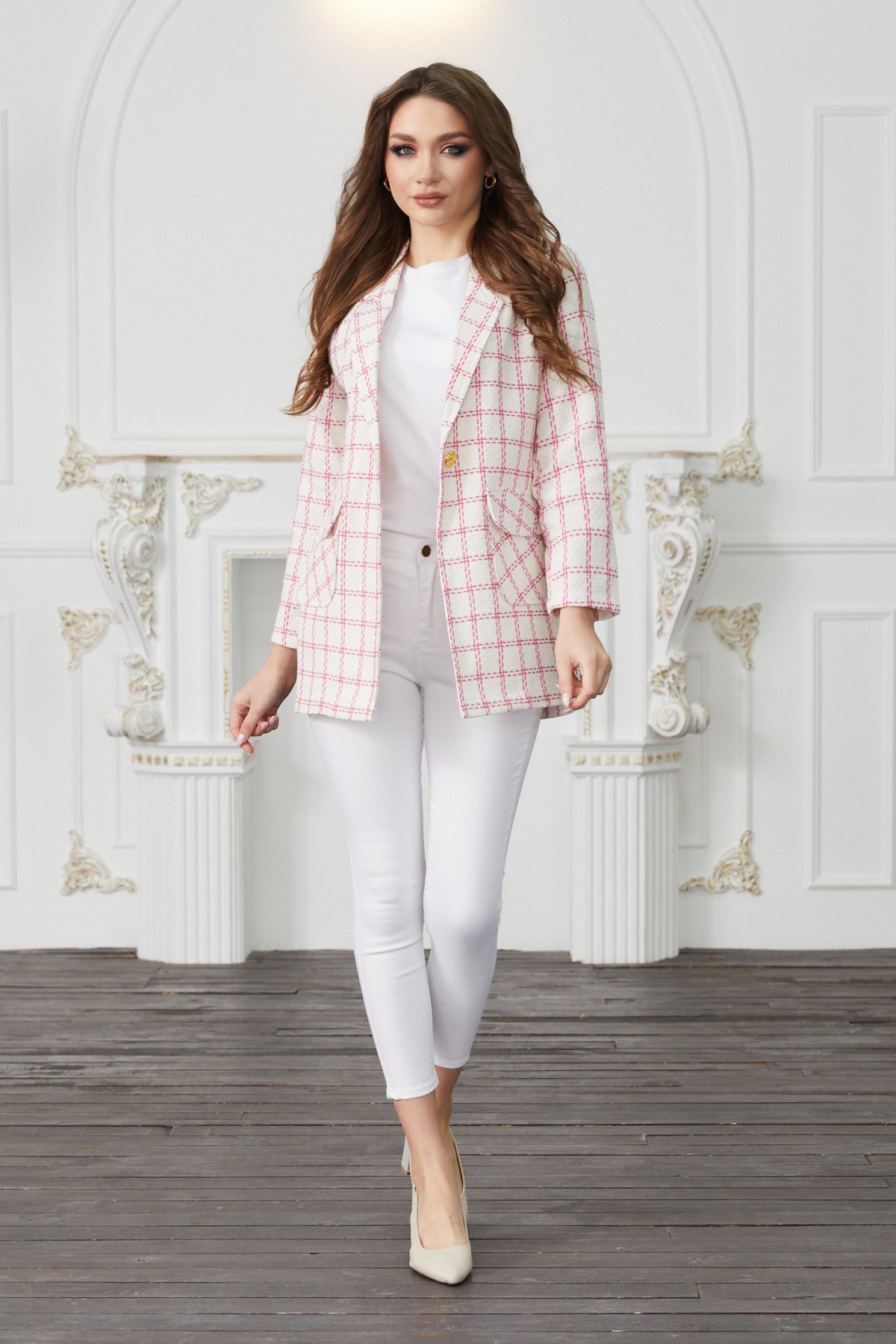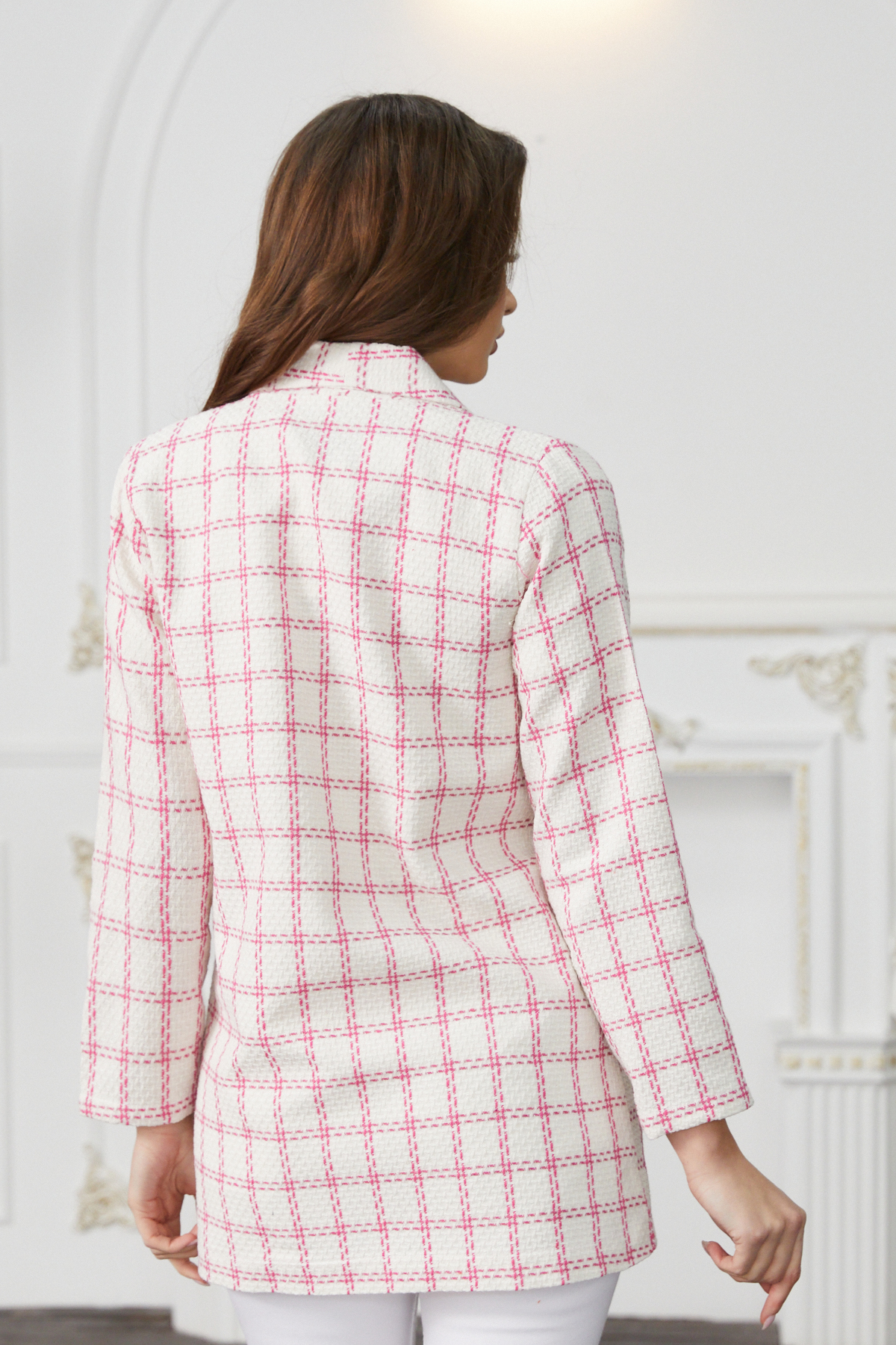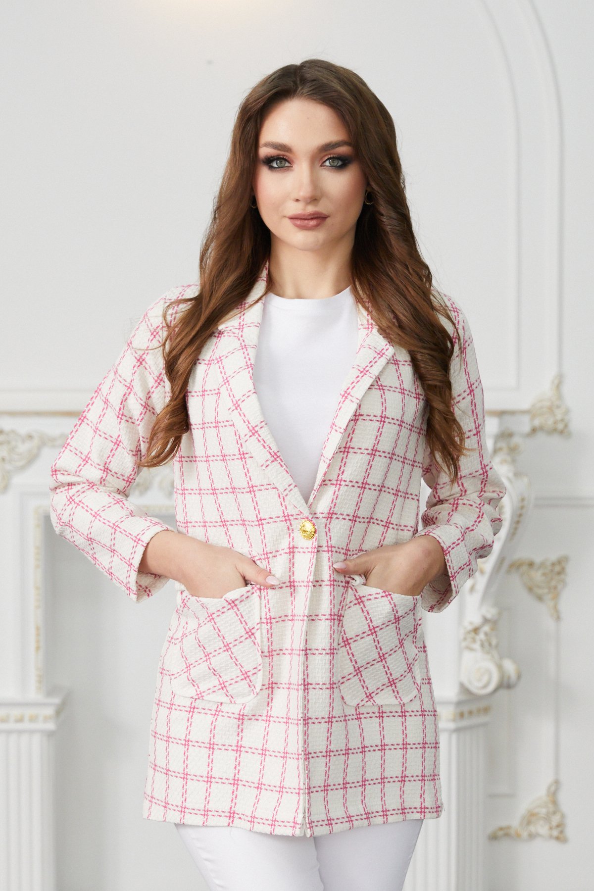 EtiketlerKadın Ekru Pembe Çift Cepli Düğmeli Ekose Ceket 23KCKTZ186
