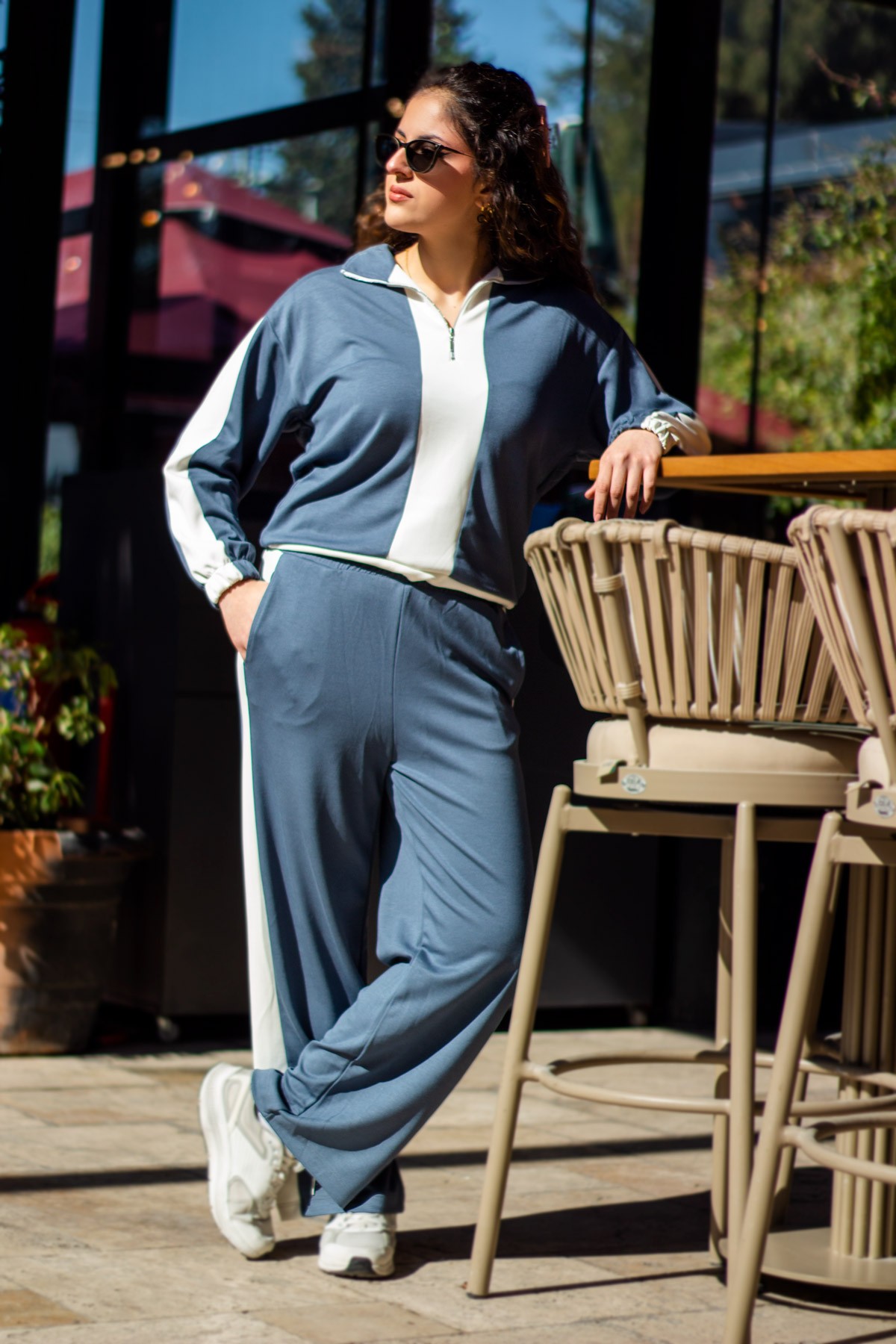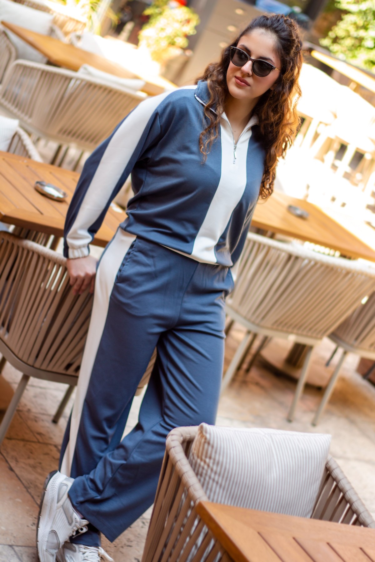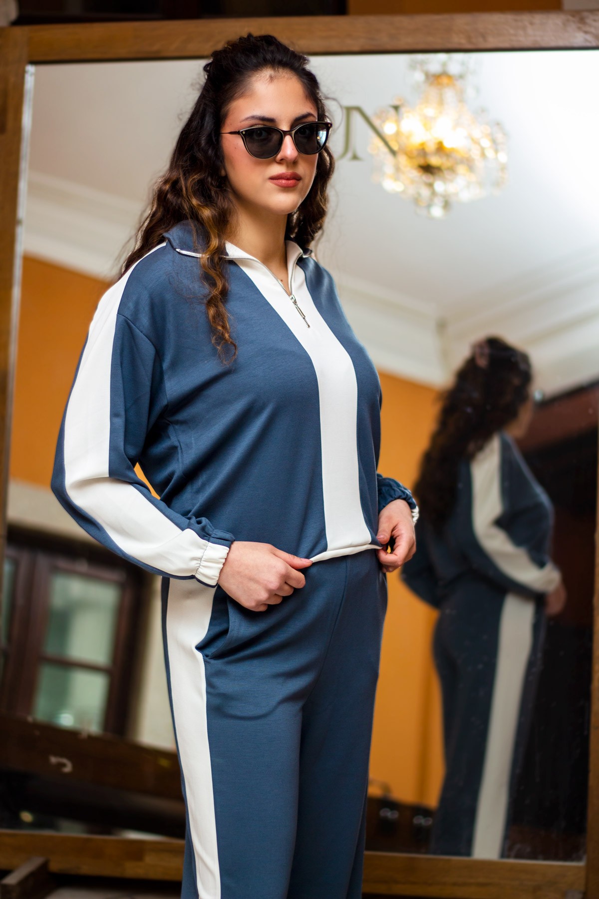 | Etiketler | Kadın İndigo Mavi Beyaz Modal Kumaş Yarım Fermuarlı Bel Büzgülü Lastikli Paça Eşofman Takımı 25KESTYOTA |