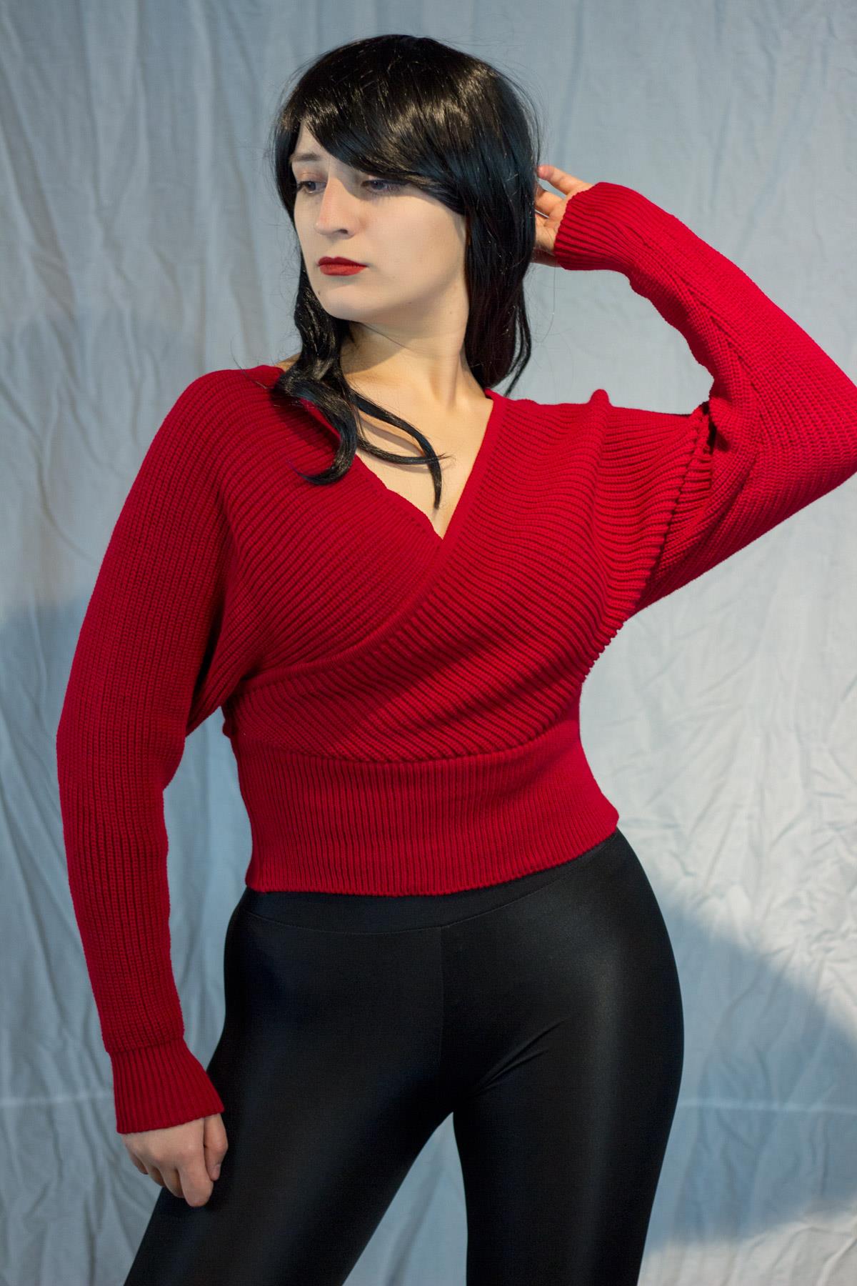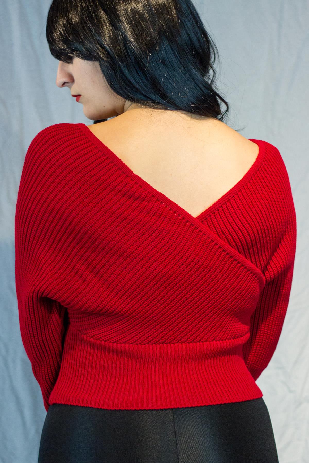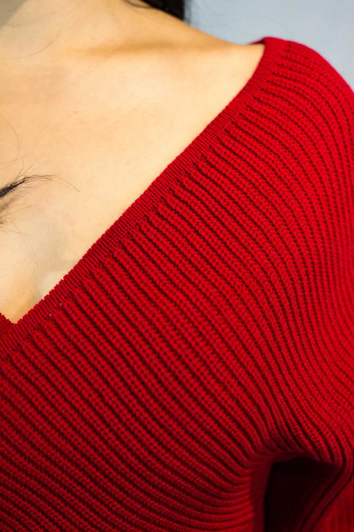 Kadın Kırmızı Kruvaze V Yaka Fitilli Tiko Kazak 20KKZKKRVZ