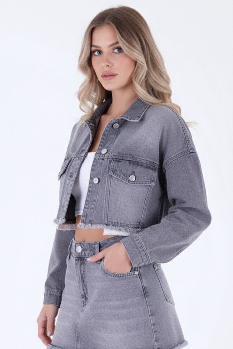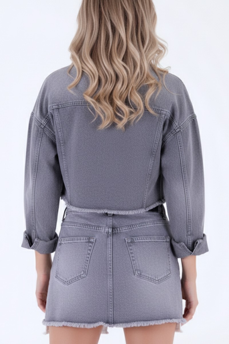 | Etiketler | Kadın Koyu Gri Astar Detaylı Saçaklı Uzun Kol Crop Kısa Kot Ceket 25KCKT6016 |