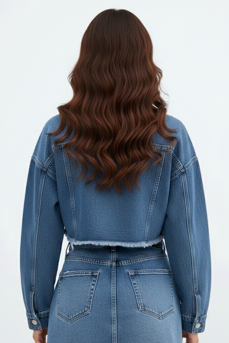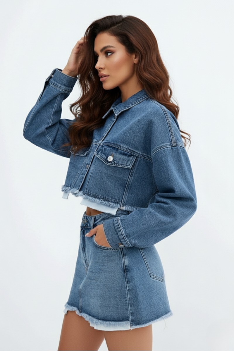 | Etiketler | Kadın Mavi Astar Detaylı Saçaklı Uzun Kol Crop Kısa Kot Ceket 25KCKT6016 |