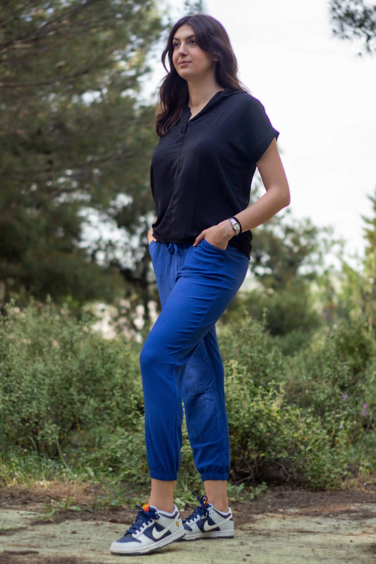 Kadın Mavi Aerobin Kumaş Kısa Duble Kol Gömlek Yaka Bluz 24KBLZK800