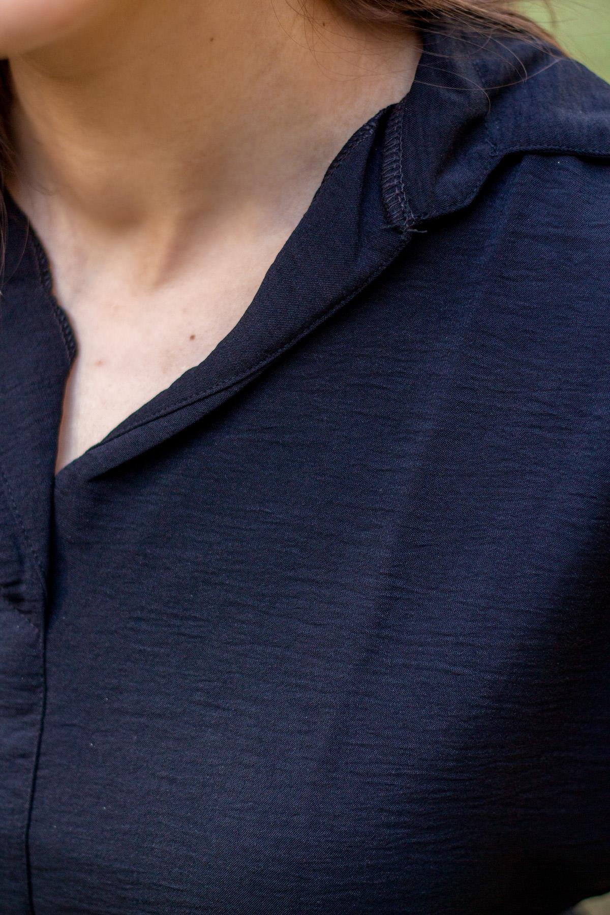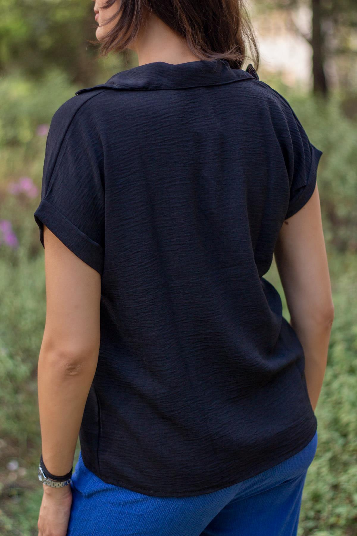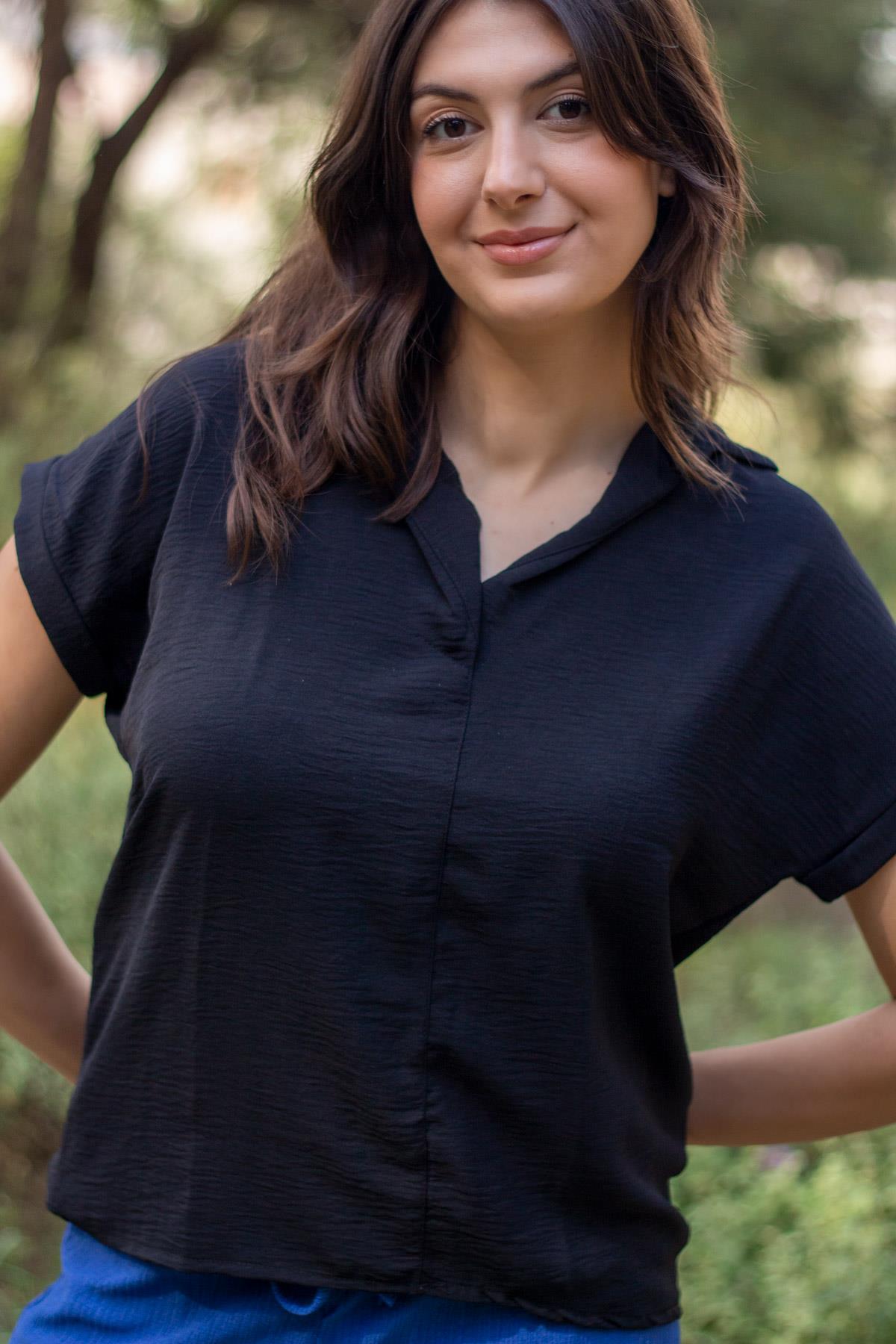 Kadın Siyah Aerobin Kumaş Kısa Duble Kol Gömlek Yaka Bluz 24KBLZK800