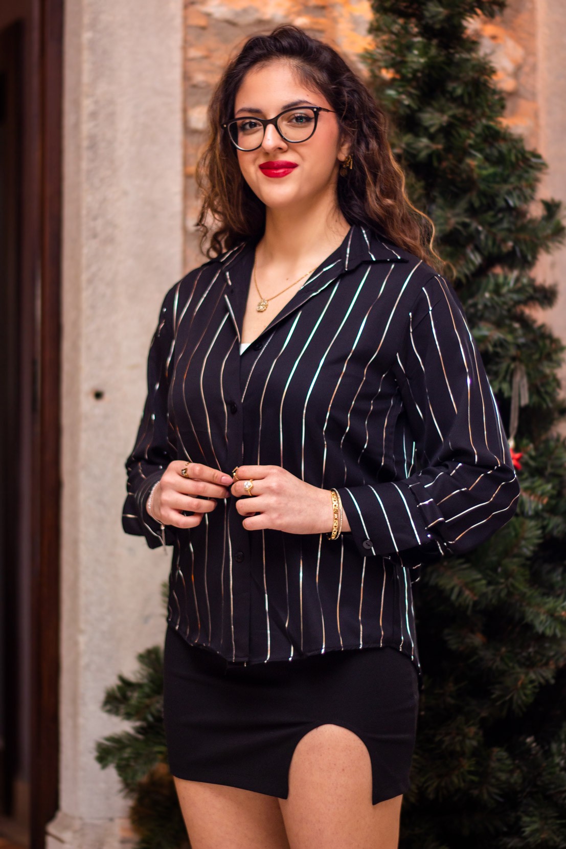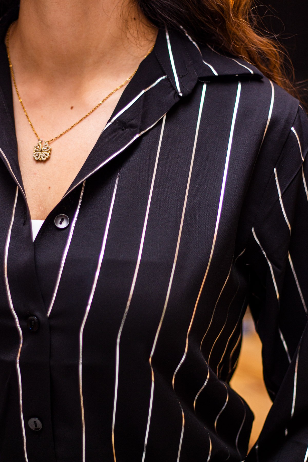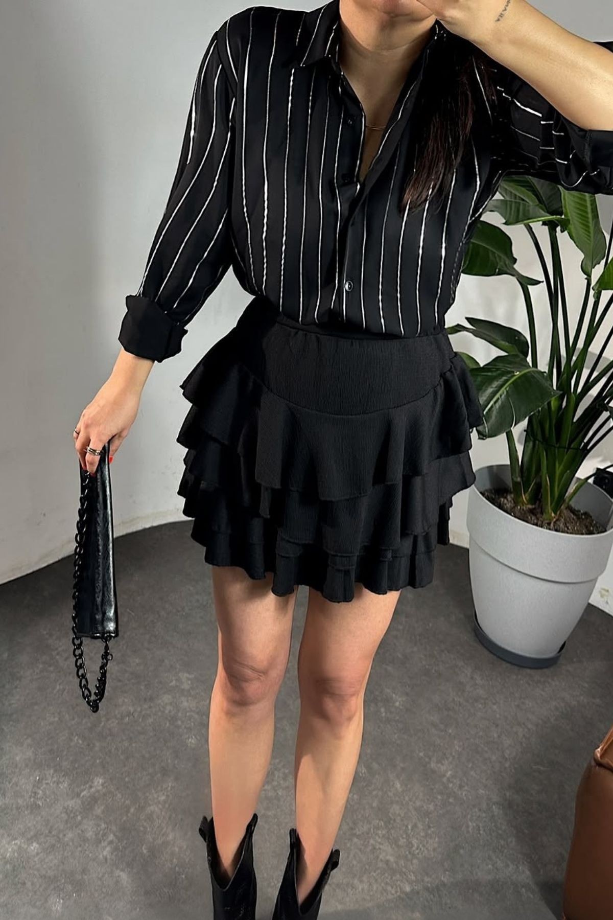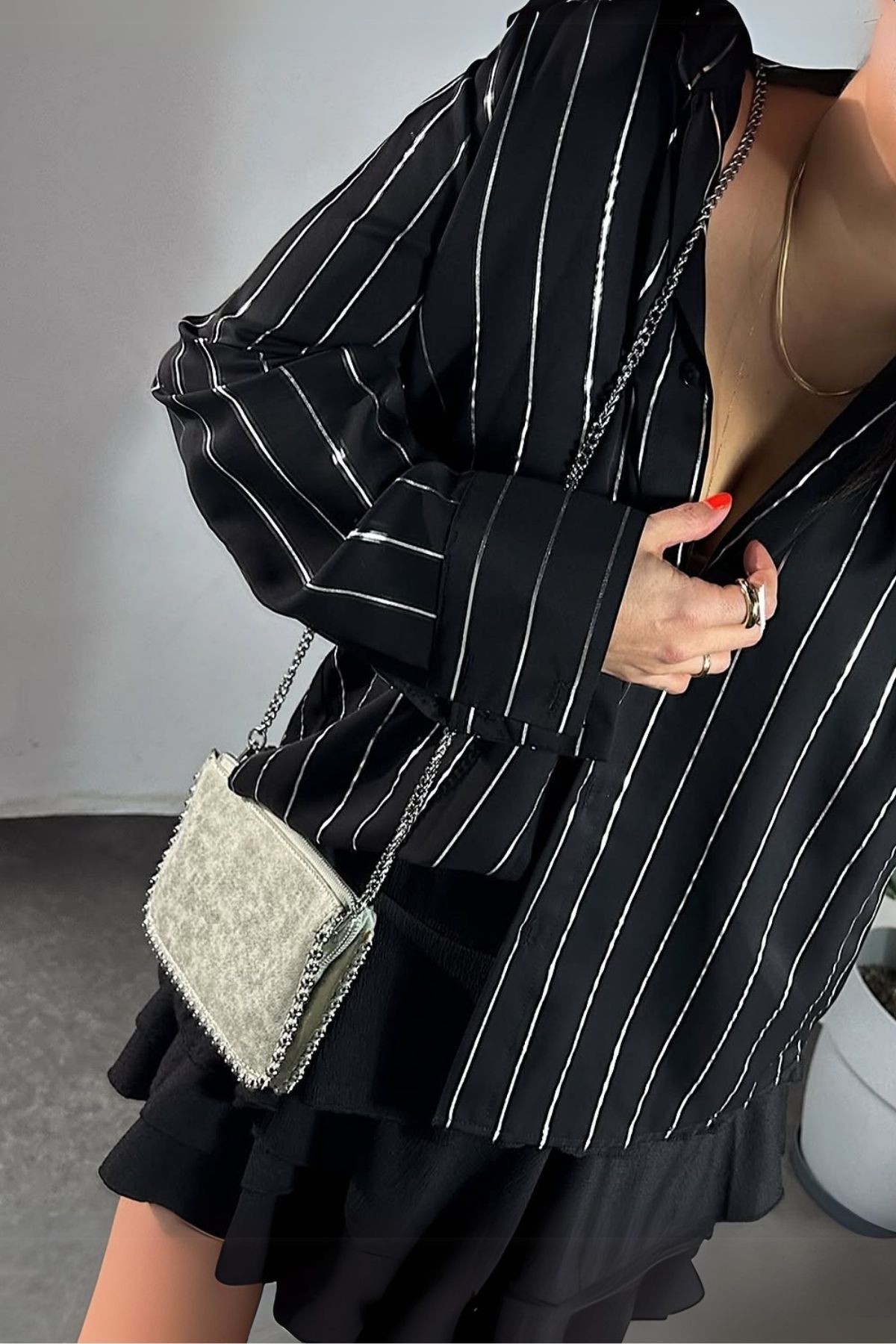 | Etiketler | Kadın Siyah Jesica Parlak Gümüş Varak Çizgili İtal Jakar Kumaş İnce Gömlek 25KGMLP009 |