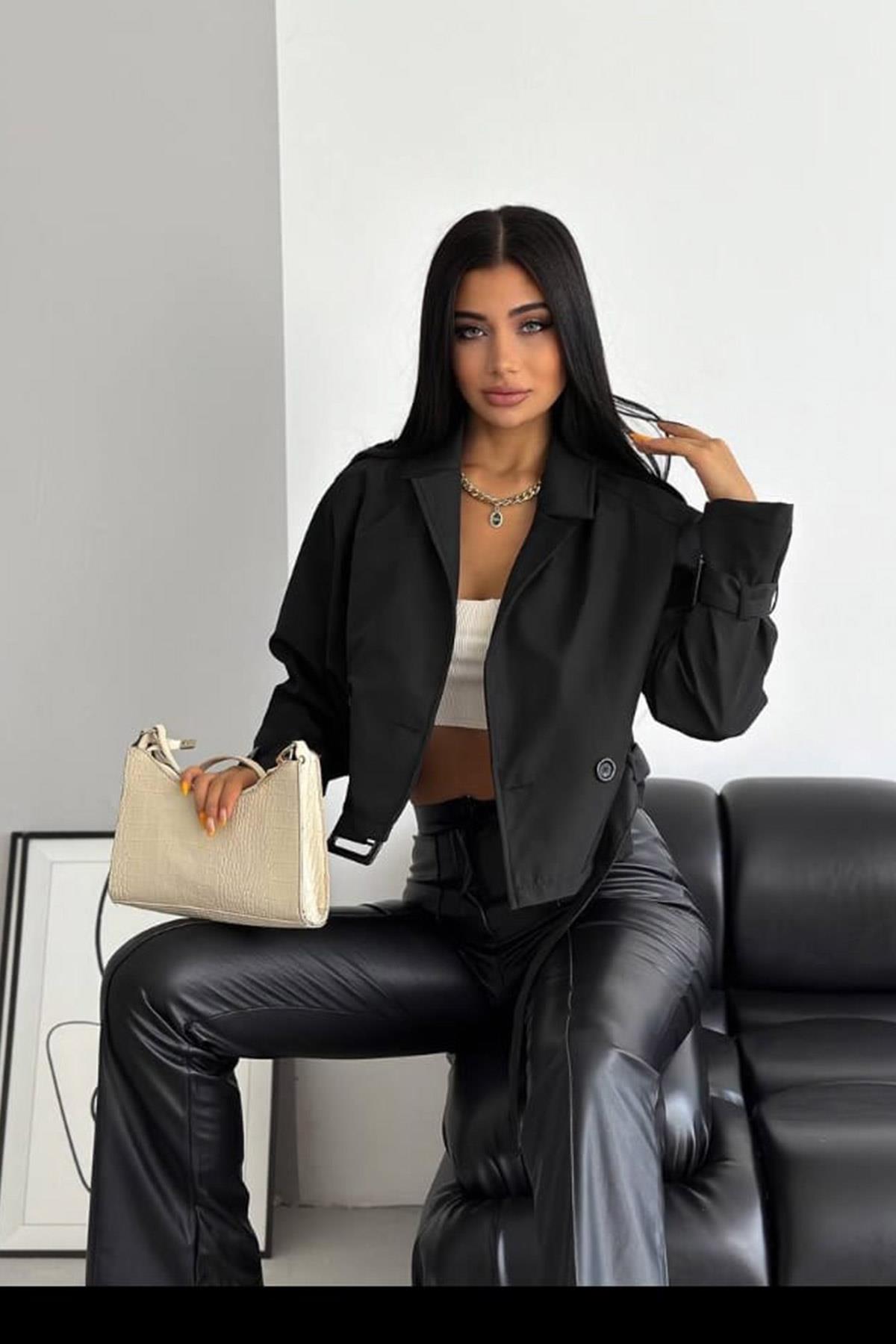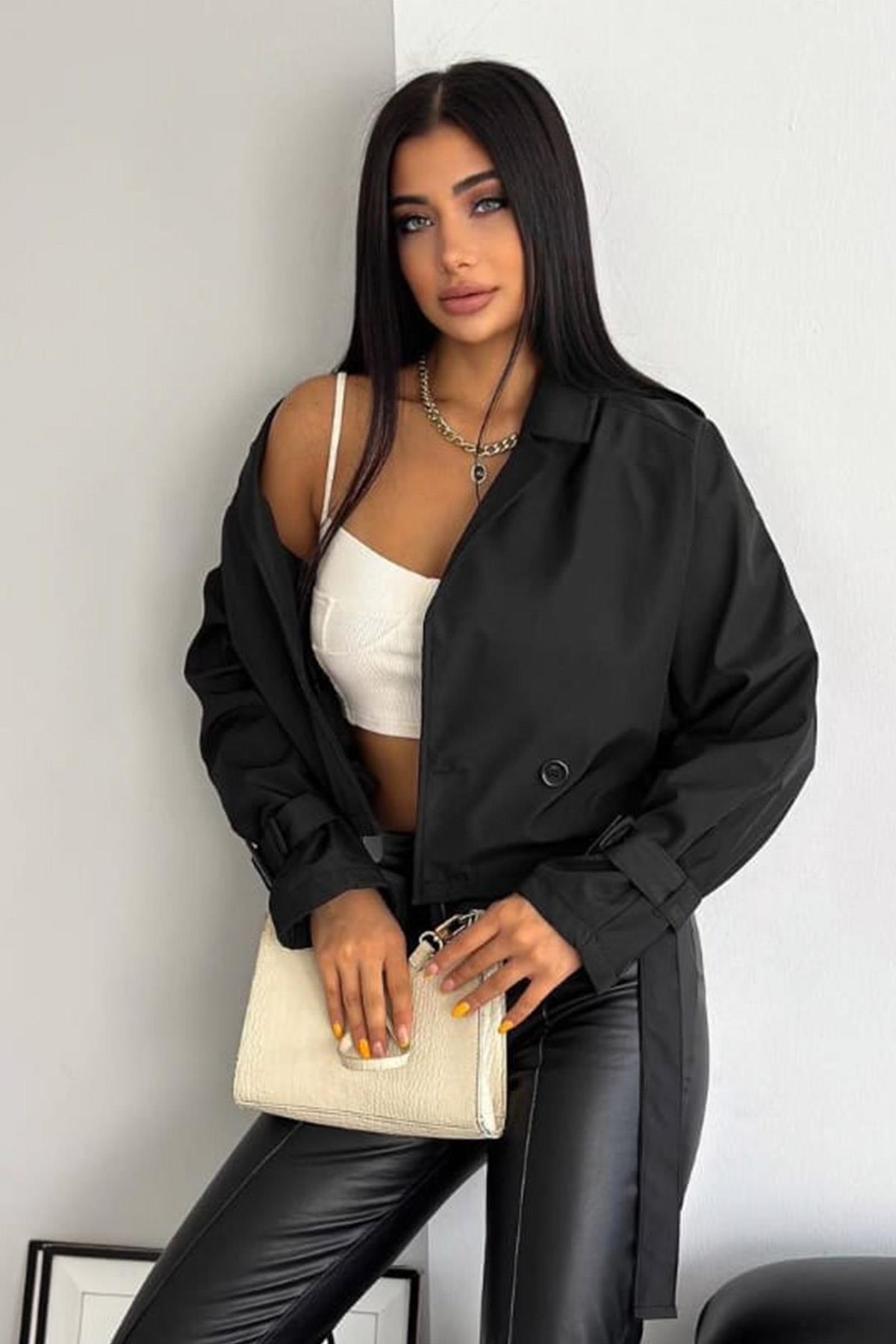 | Etiketler | Kadın Siyah Kemer Detaylı Su İtici Kısa Crop Oversize Trençkot 23KTRTP014 |