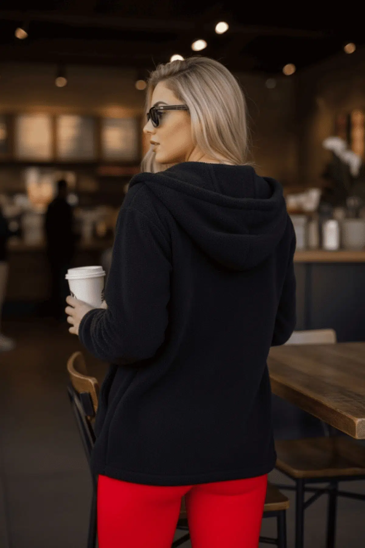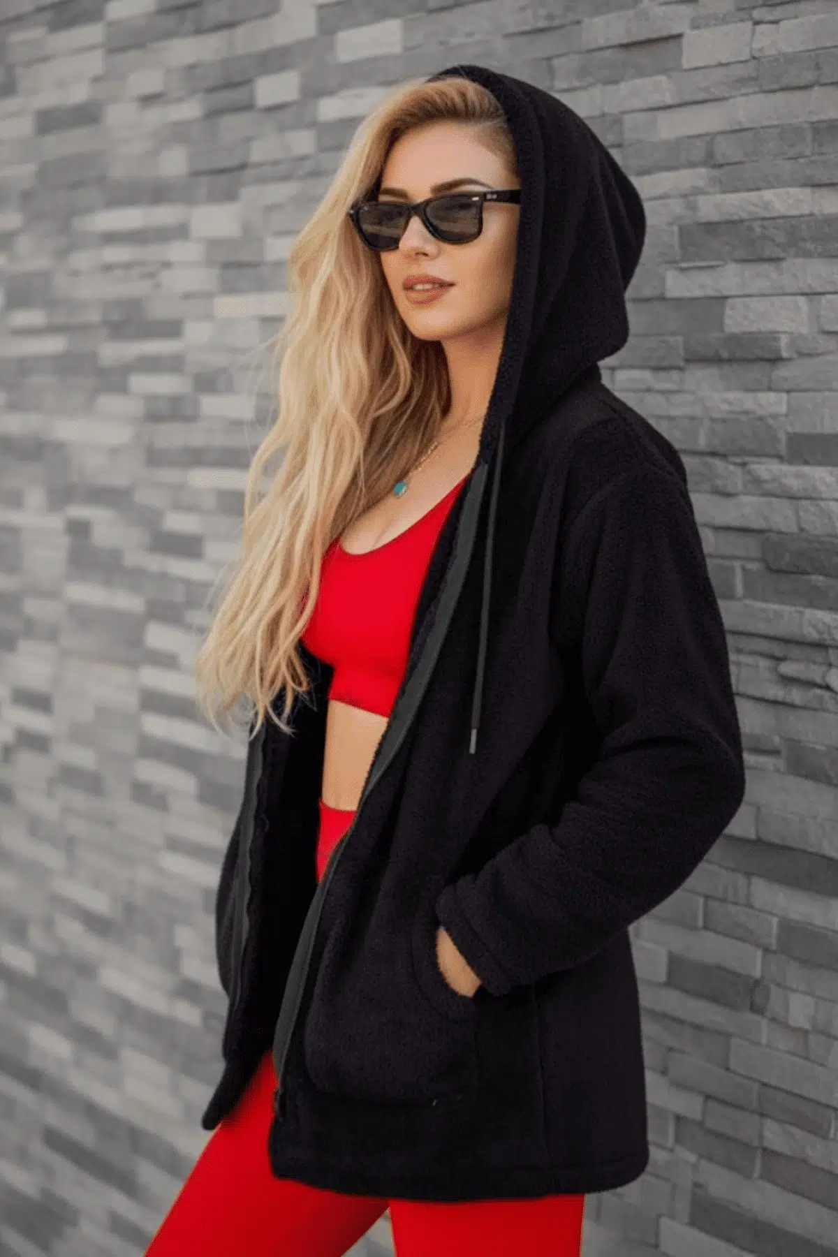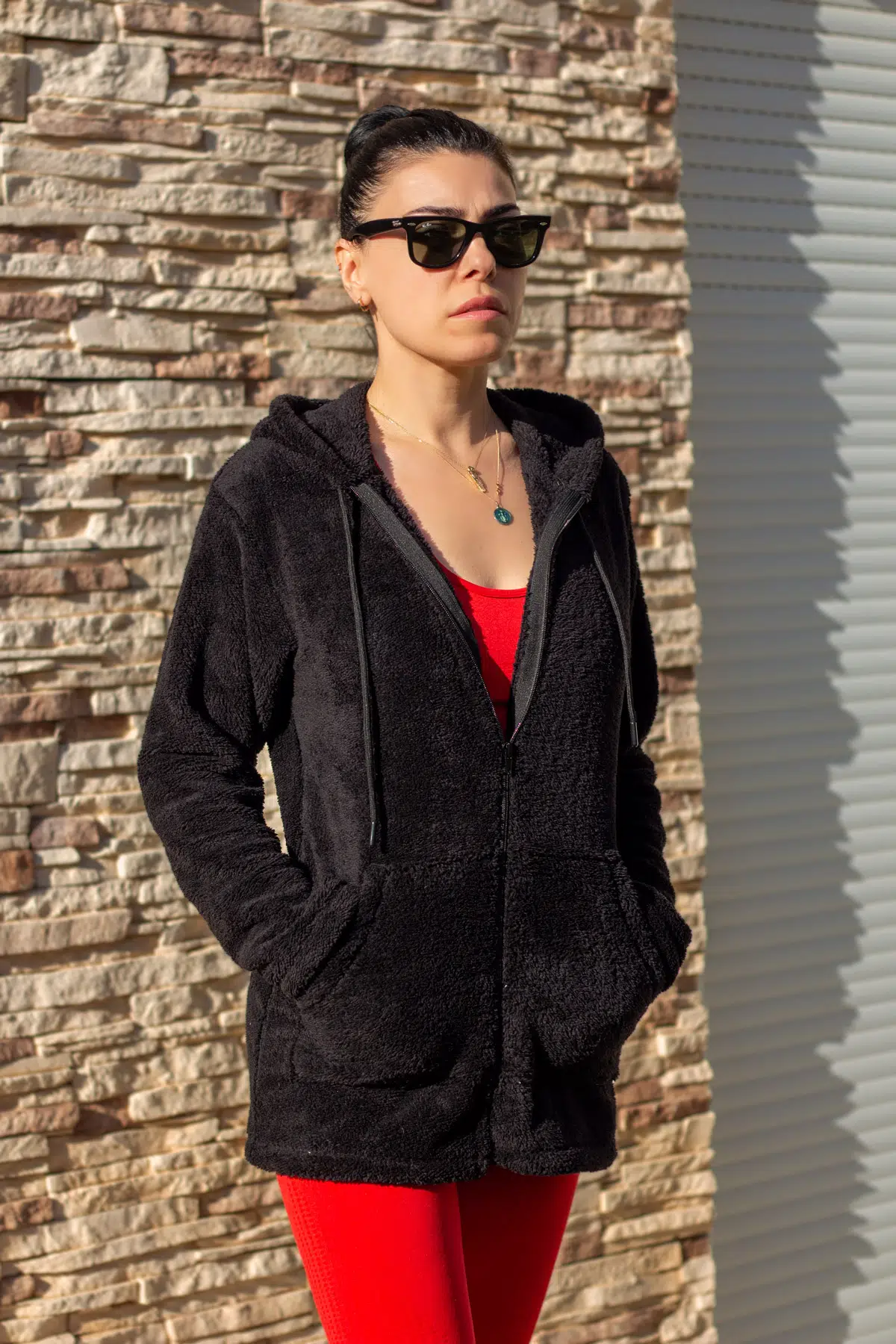 Kadın Siyah Peluş Kalın Fermuarlı Kapüşonlu Cepli Ceket 23KCKTMY50
