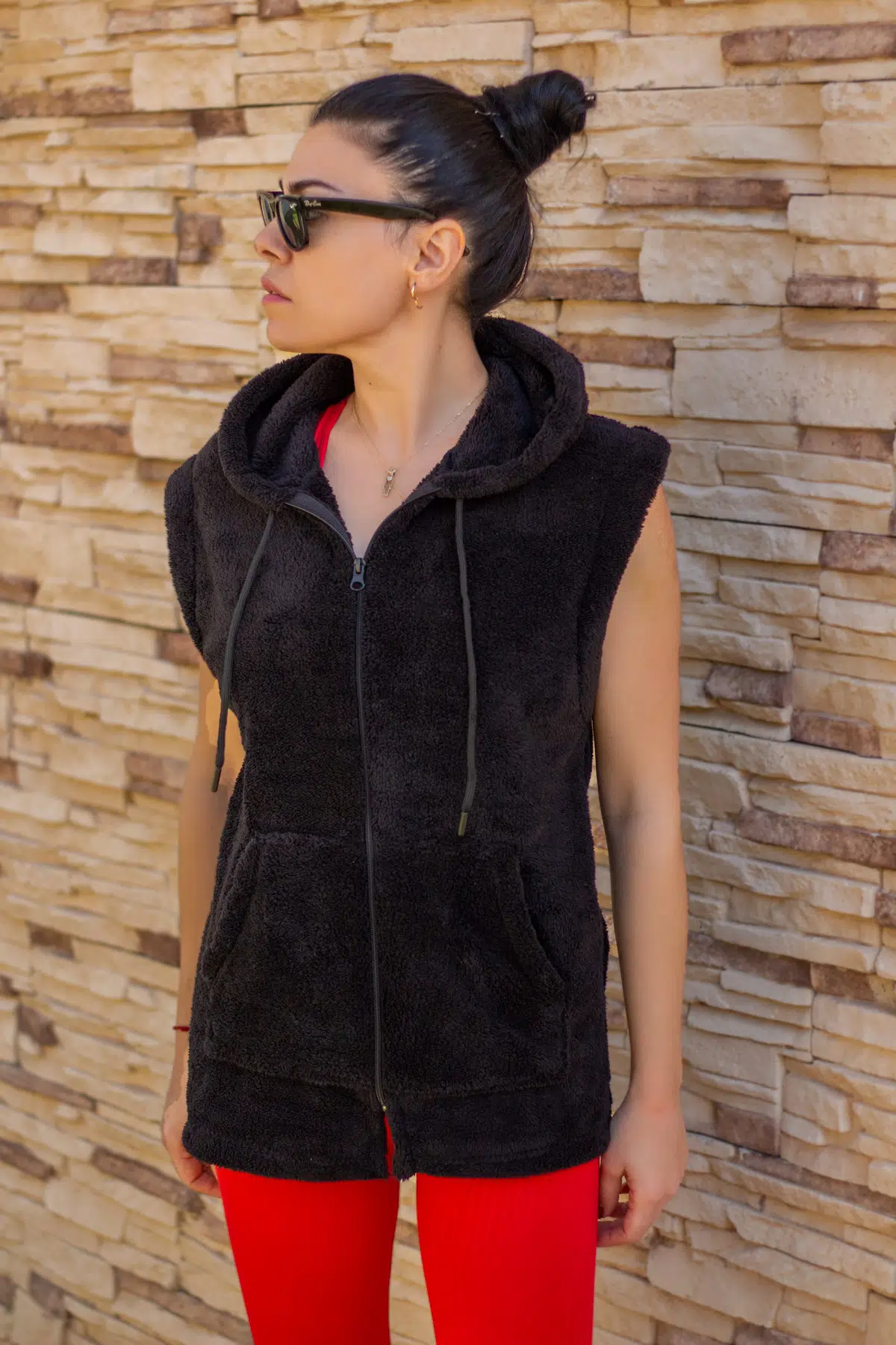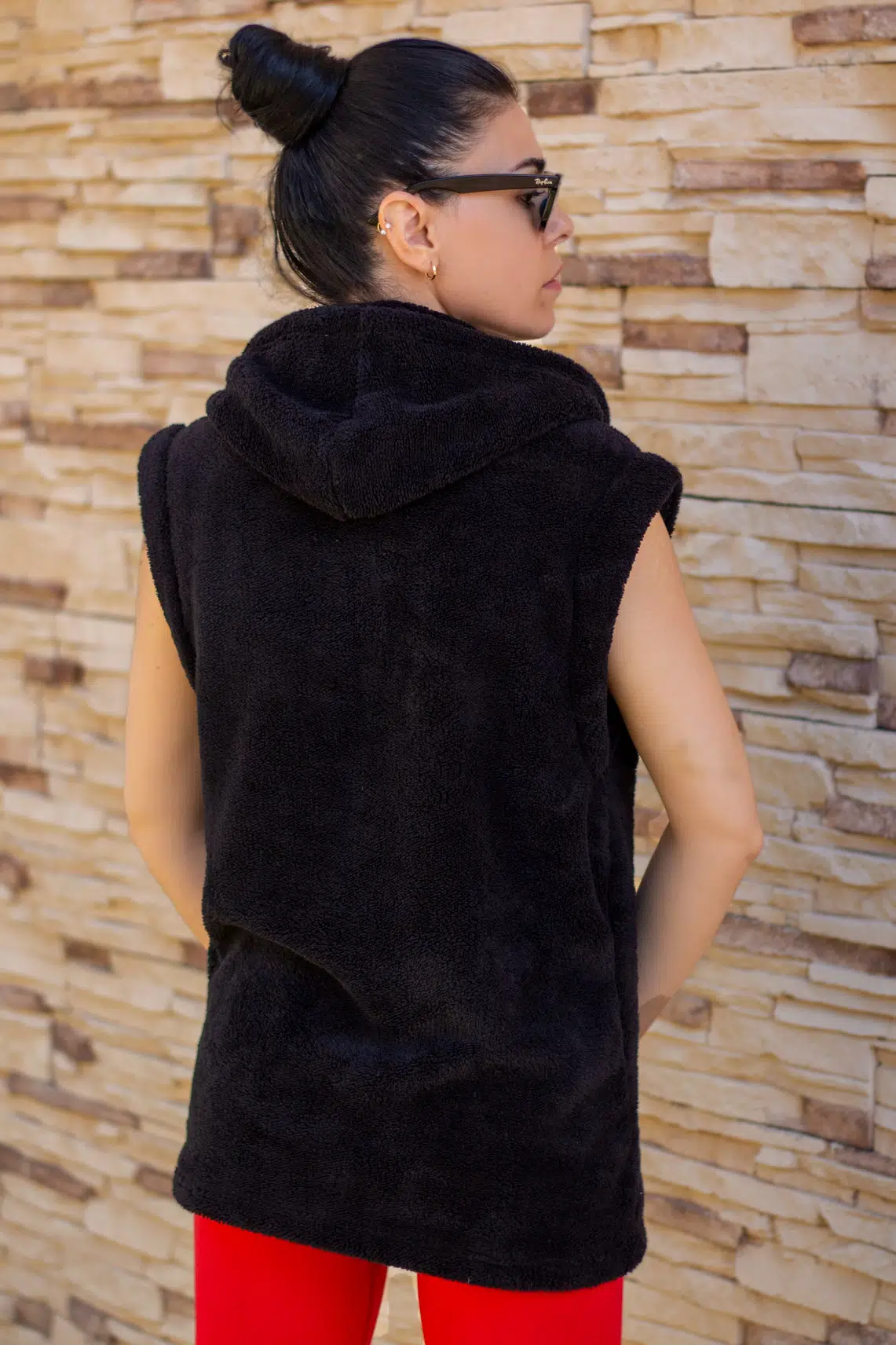 Kadın Siyah Peluş Kalın Fermuarlı Kapüşonlu Yelek 23KYLKMY01