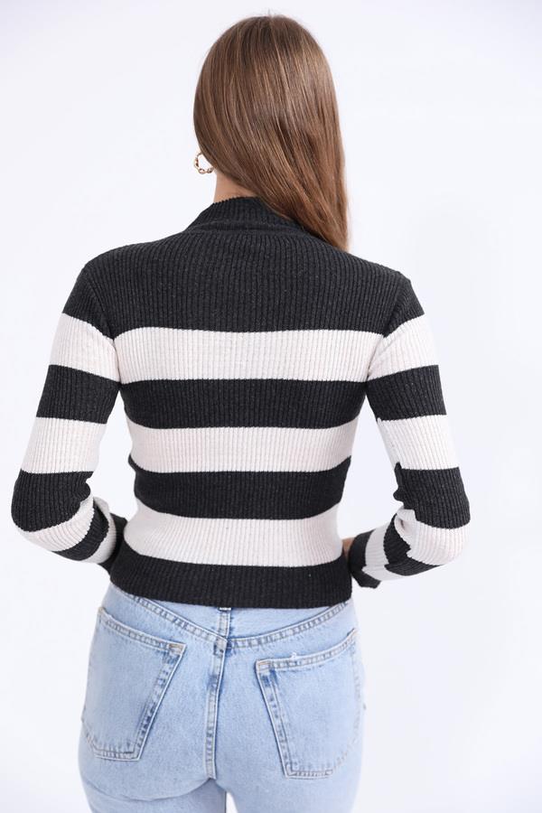 EtiketlerKadın Siyah Yarım Balıkçı Yaka Çizgili Triko Kazak 21KKZKBYEZ
