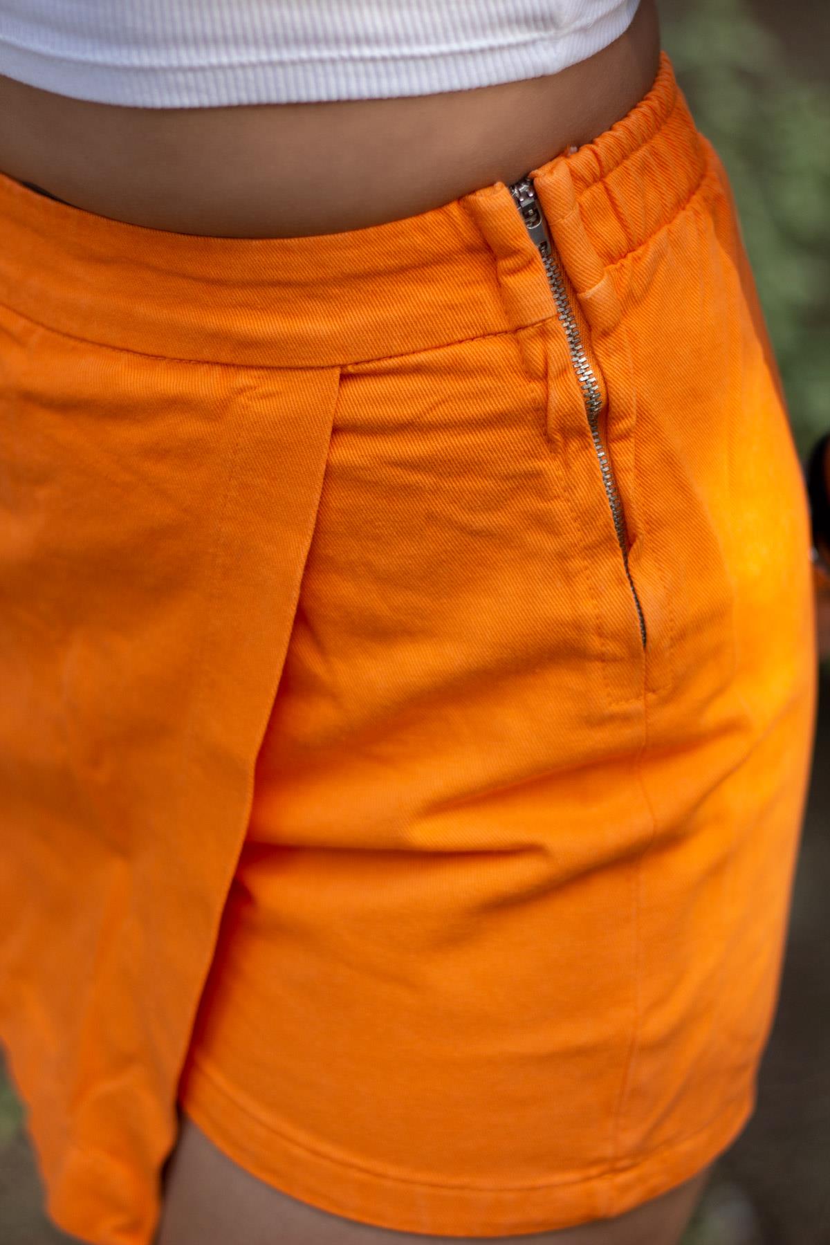 | Etiketler | Kadın Turuncu Gabardin Asimetrik Kapamalı Fermuarlı Kot Şort Etek 24KSRTSETE |