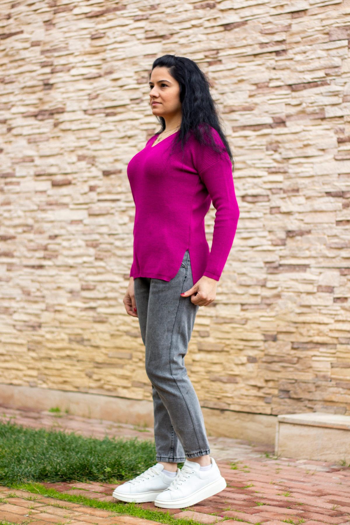 Lila V Yaka Yırtmaçlı Fitilli Triko Kadın Kazak 20KKZKYRTC