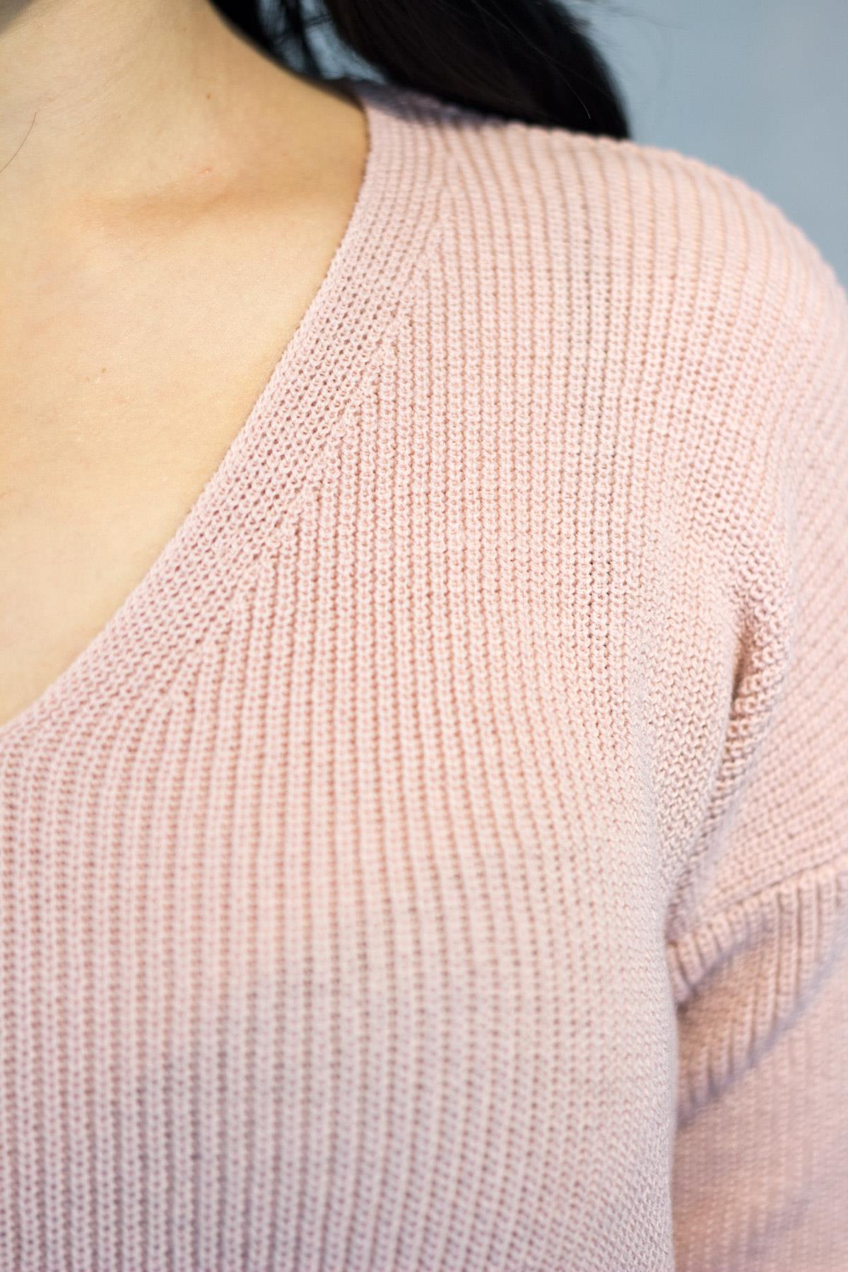 Pudra V Yaka Yırtmaçlı Fitilli Triko Kadın Kazak 20KKZKYRTC