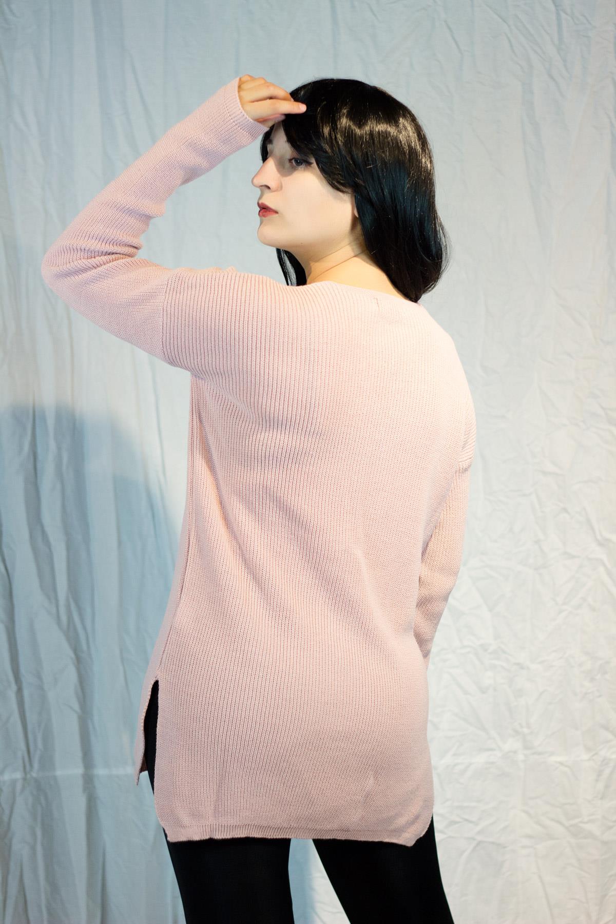 EtiketlerPudra V Yaka Yırtmaçlı Fitilli Triko Kadın Kazak 20KKZKYRTC
