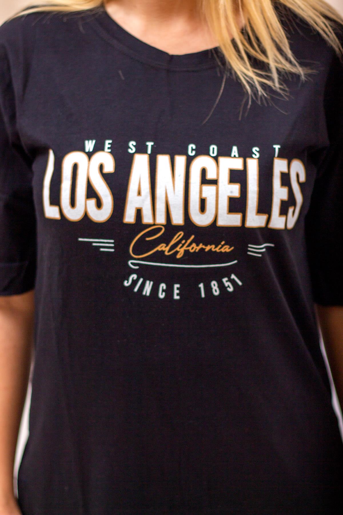 | Etiketler | Siyah Los Angeles Baskılı Yırtmaçlı Duble Kol Kadın Tişört 22KTSHLOSE |
