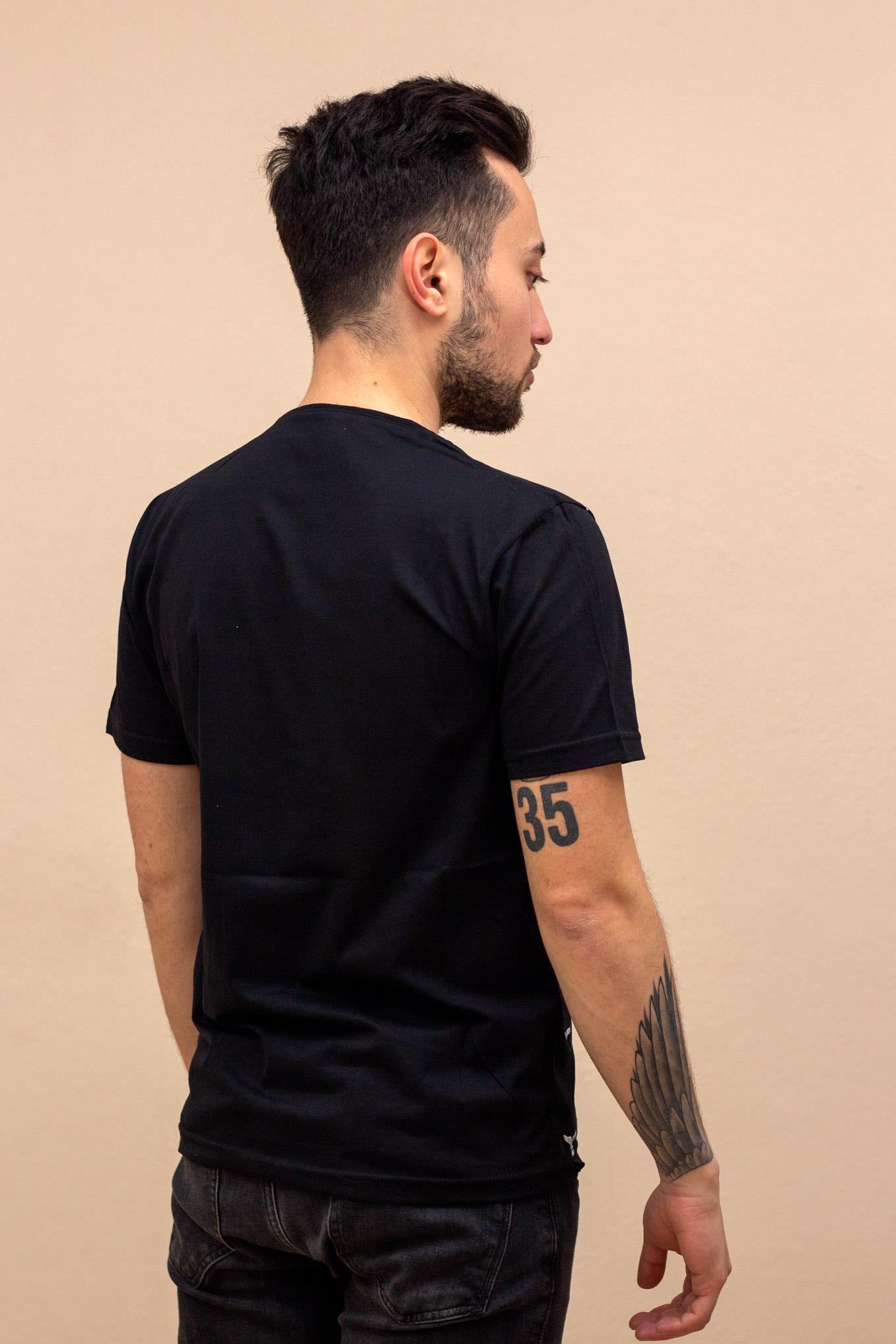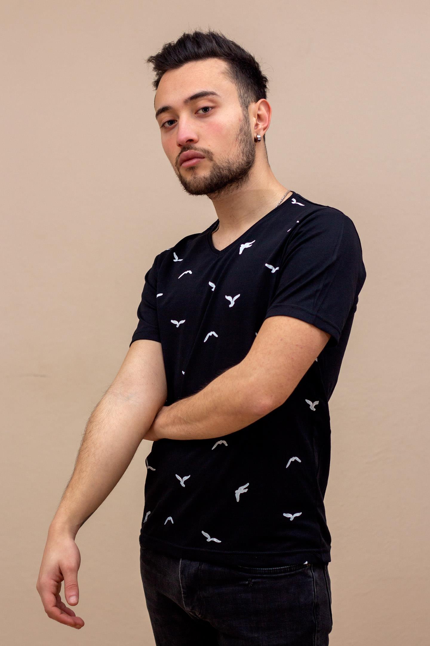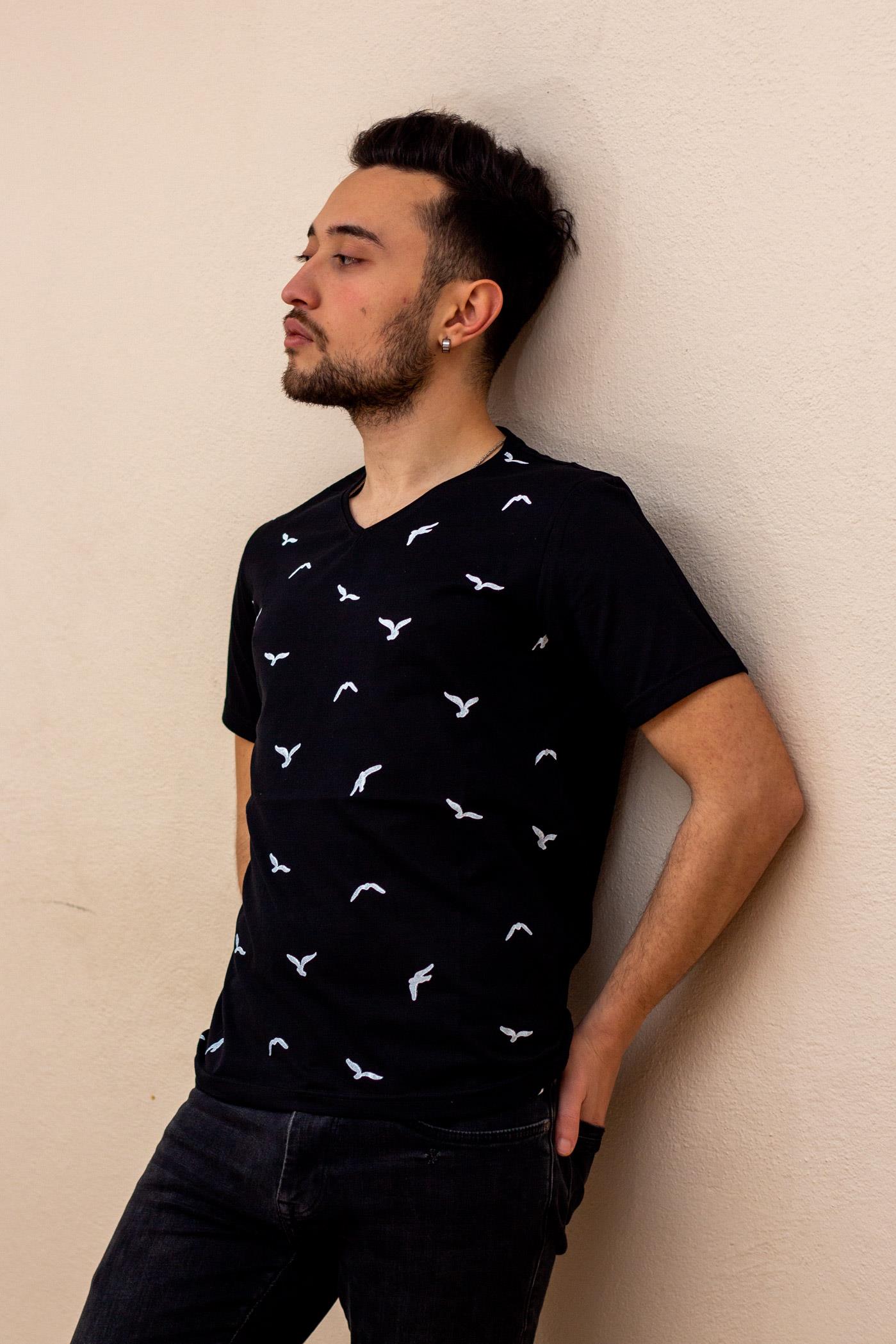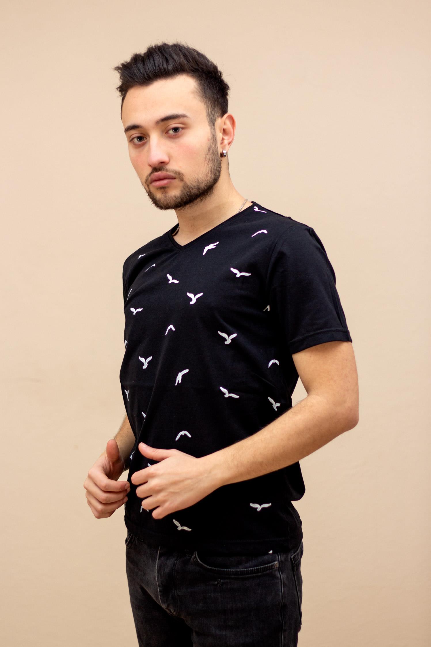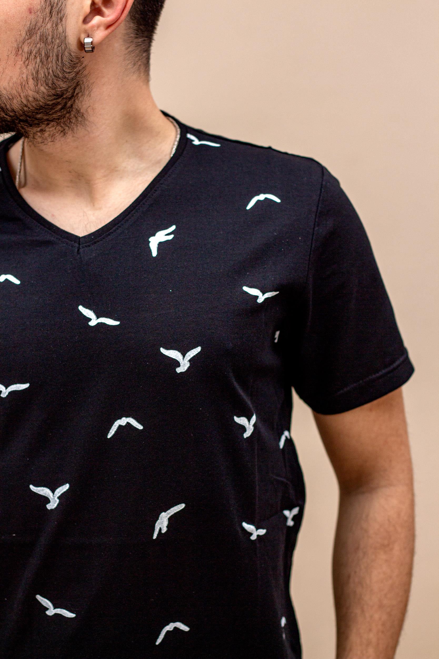 Siyah Martı Baskılı Kısa Kollu V Yaka Erkek Tişört 22ETSHVMRT
